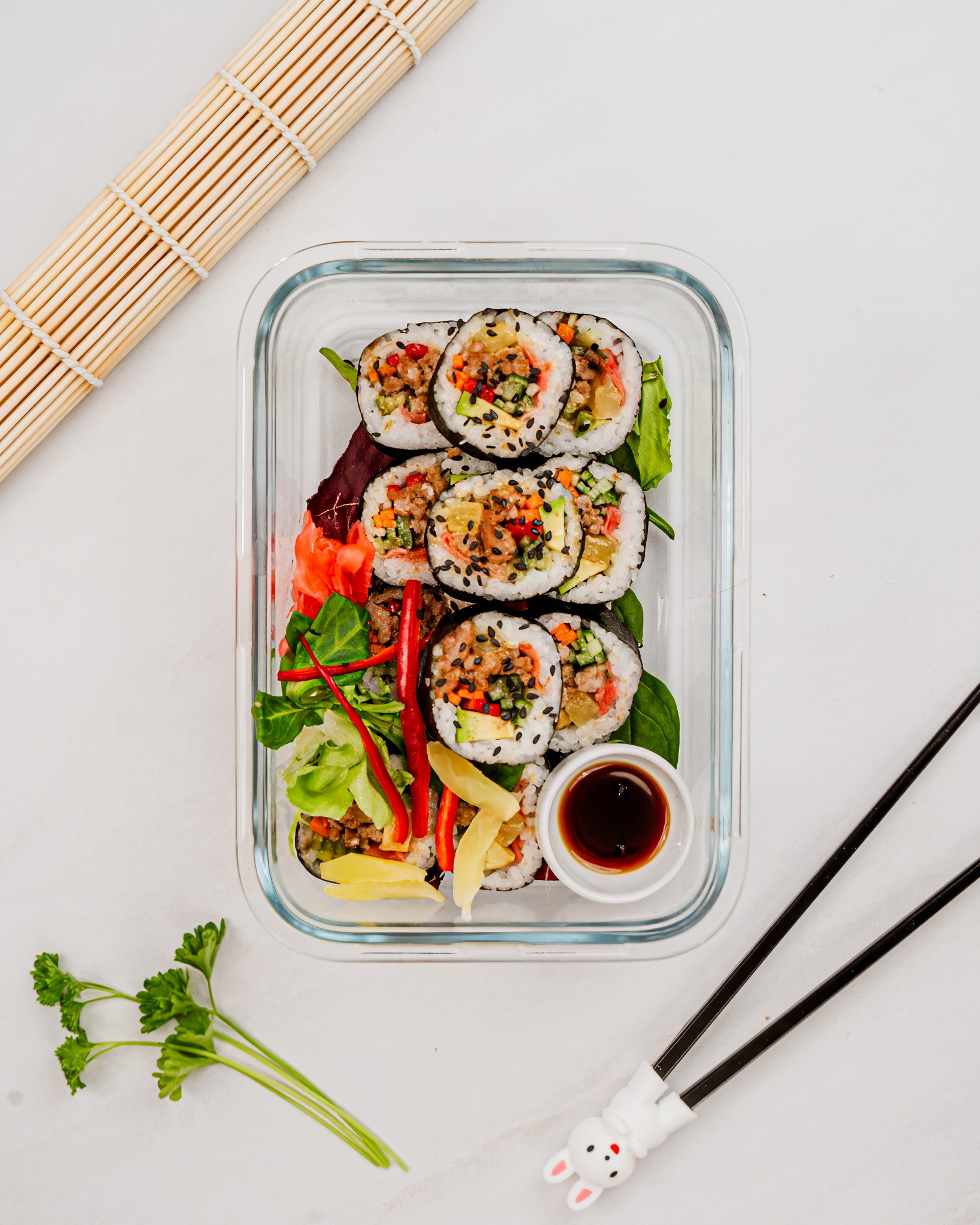 Nguyên liệu: 200g thịt heo băm, 2 chén cơm sushi đã nấu chín, 2 thìa xì dầu, 1 thìa cà phê dầu mè, 1 củ cà rốt, 1 quả dưa chuột, 1/2 quả bơ, củ cải vàng muối, gừng hồng muối, rong biển (nori) để gói, mè rang để rắc, một ít rau xà lách để trang trí _______________