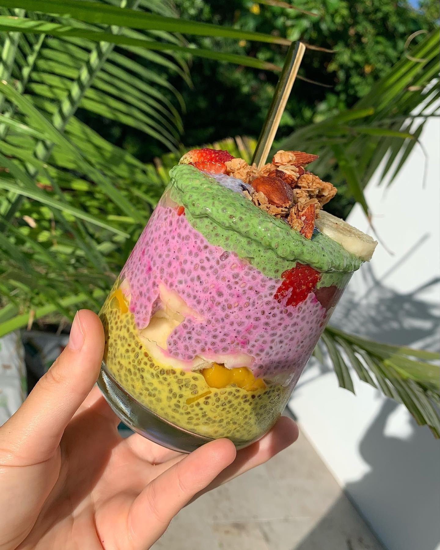 Good morning angels! I hope you’re all well & having a lovely Sunday🙈June is Pride Month! so we are celebrating with this stunning, rainbow chia pudding jar this morning🌈 layers of turmeric mango, dragonfruit strawberry, matcha & blueberry chia pudding - 4 flavours of ultimate bliss!🤤topped with some fresh fruits and almond granola! To make this, all you have to do is make your chia pudding like you normally would then stir in your flavours in the morning - recipe below 👇 have a lovely day angels filled with delicious and nutritious food!🌈💕🌴