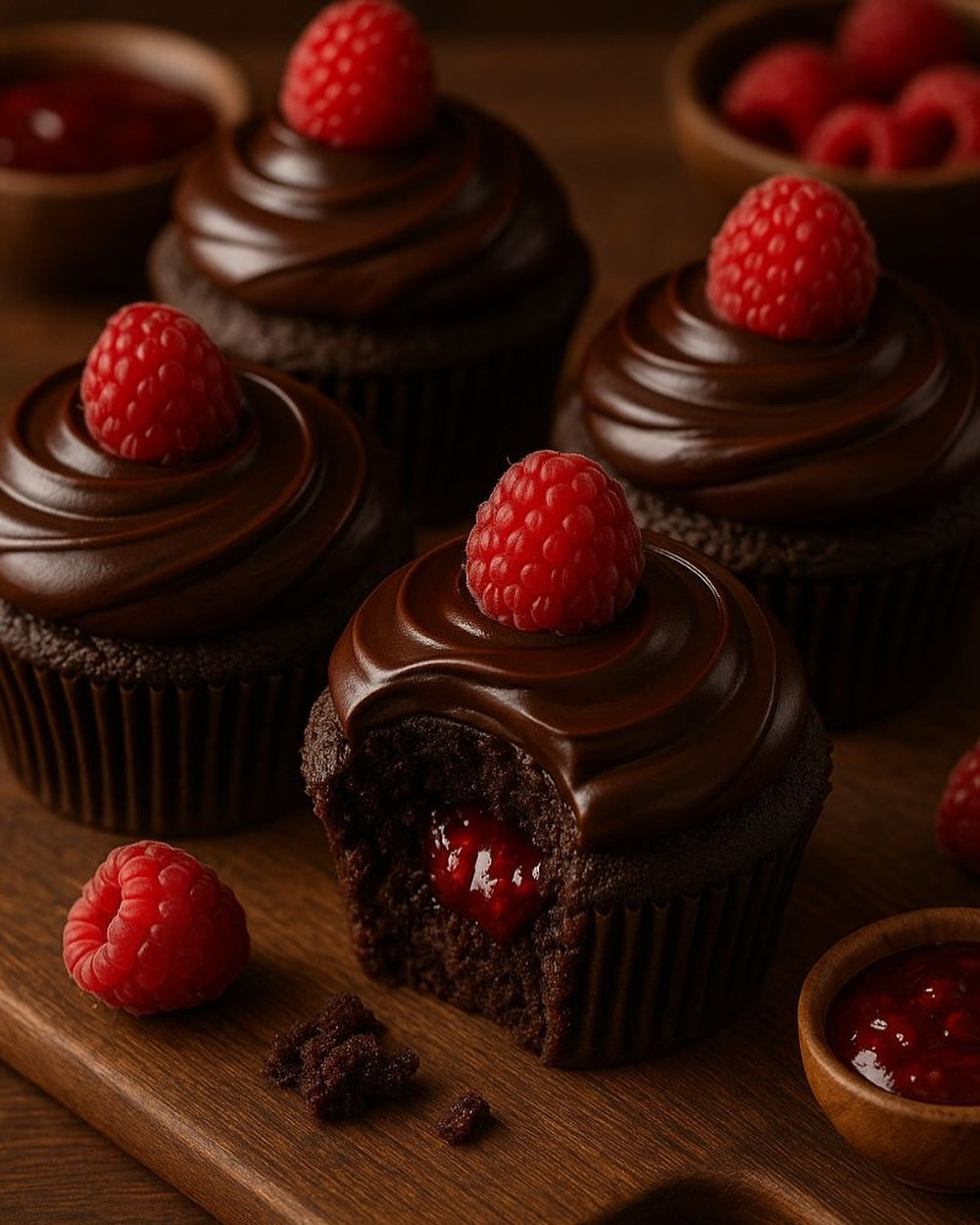 Moist dark chocolate cupcakes filled with raspberry jam and topped with a silky dark chocolate ganache. A surprise burst of fruit in every decadent bite — elegant, intense, and unforgettable.