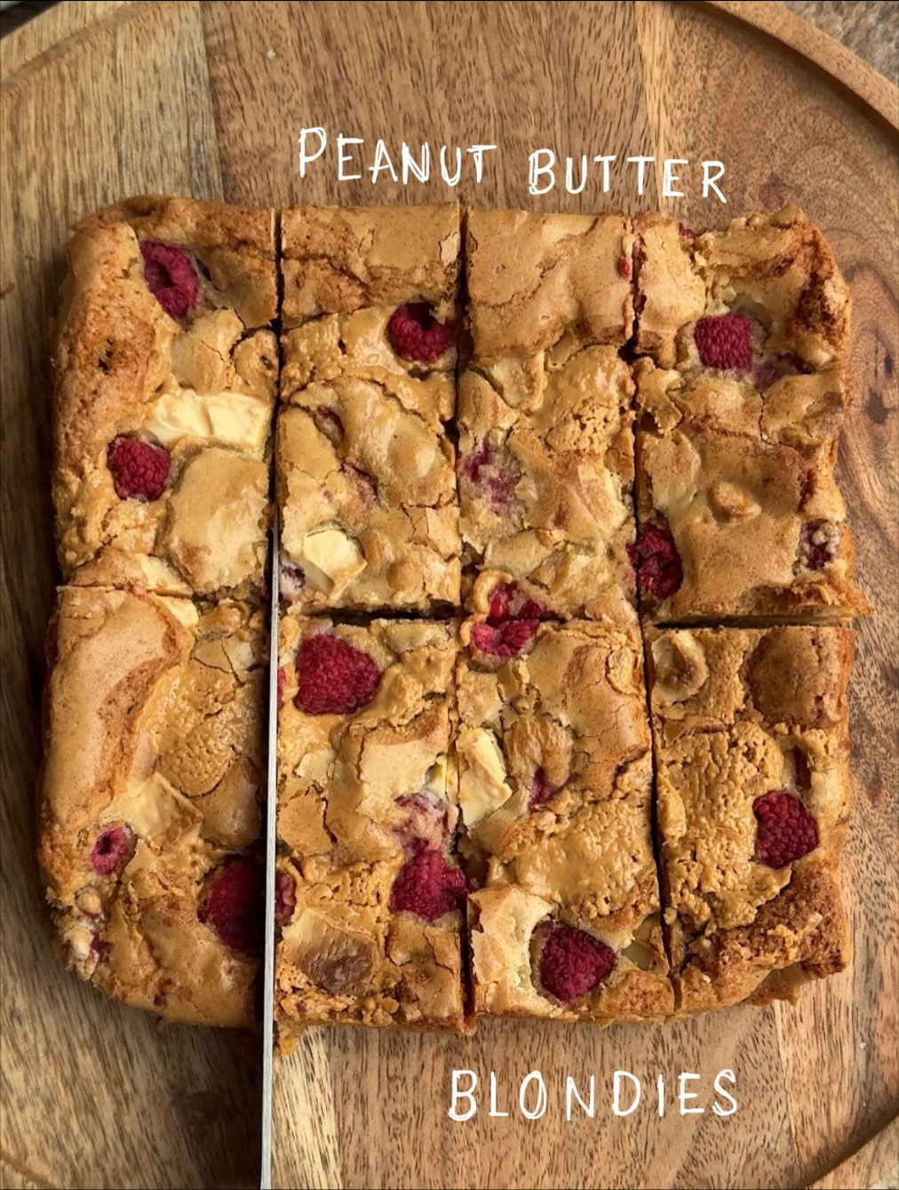 I made peanut butter blondies with raspberries and white chocolate!!!!