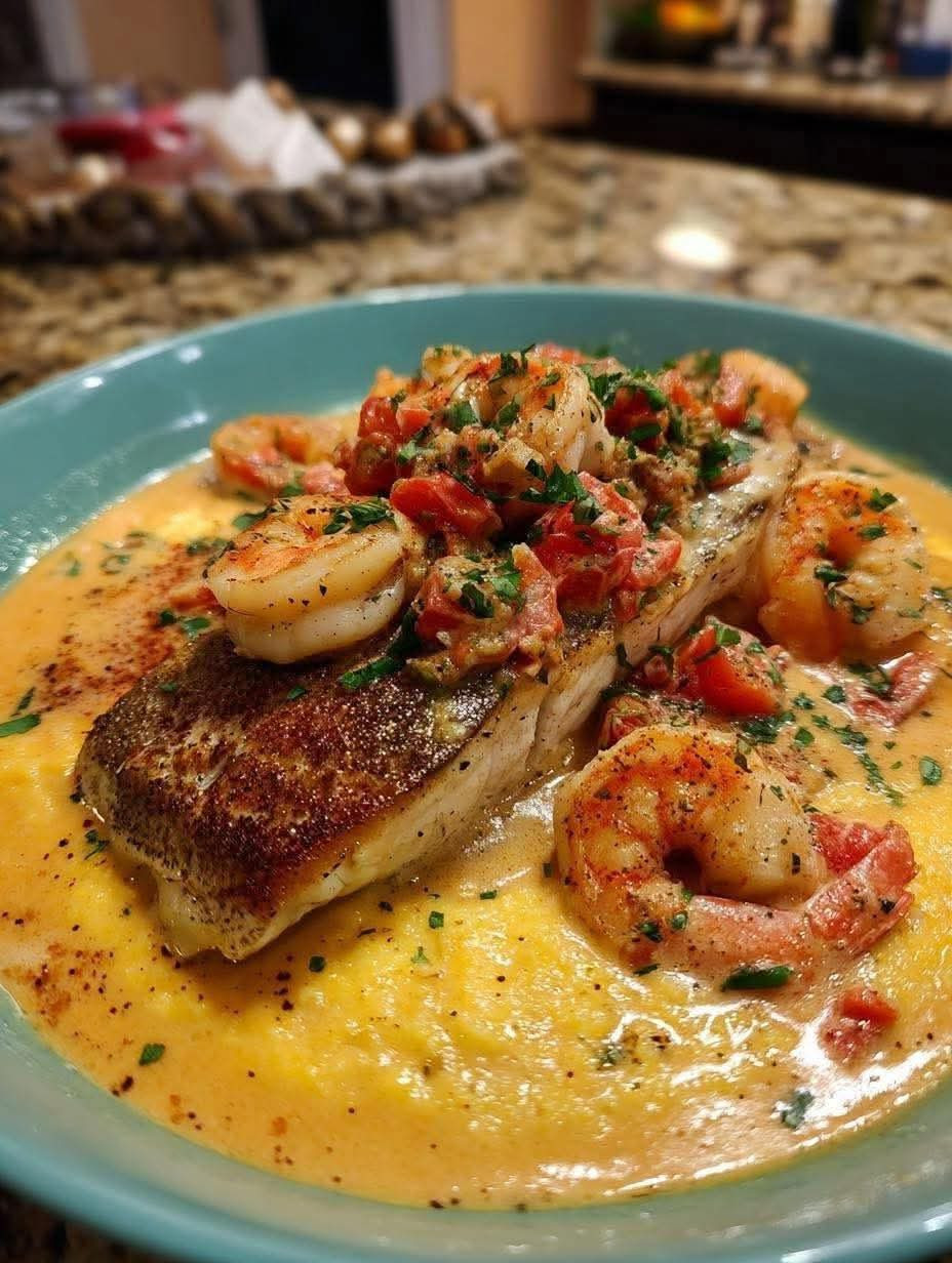 5️⃣ Serve snapper and shrimp over grits, topped with the Cajun cream sauce.