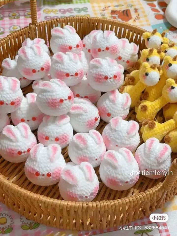 Rổ thú bông móc len hình thỏ trắng và hươu vàng dễ thương