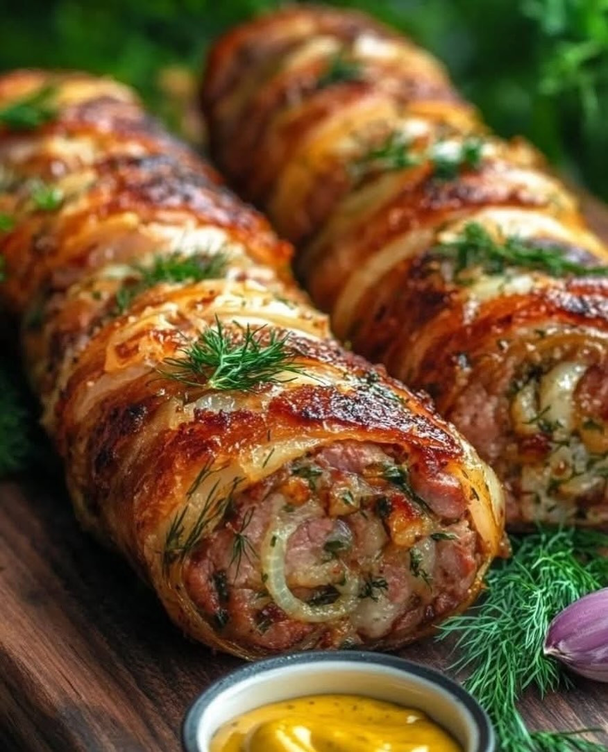 🎯 3️⃣ Monte o Rocambole (5 min) 👉 Espalhe o recheio de cogumelos uniformemente sobre a carne, deixando uma borda de 2 cm nas extremidades. 👉 Enrole a carne firmemente, começando pela lateral mais longa, para formar um rocambole apertado. 👉 Use barbante de cozinha para amarrar o rocambole em vários pontos, garantindo que mantenha o formato.