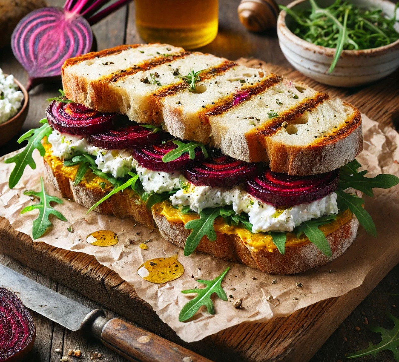 • 2 slices of artisan crusty bread • ½ cup whipped goat cheese • ½ roasted beet, thinly sliced • A handful of fresh arugula • 1 tsp honey (drizzled) • A pinch of sea salt and black pepper • Optional: crushed walnuts for texture