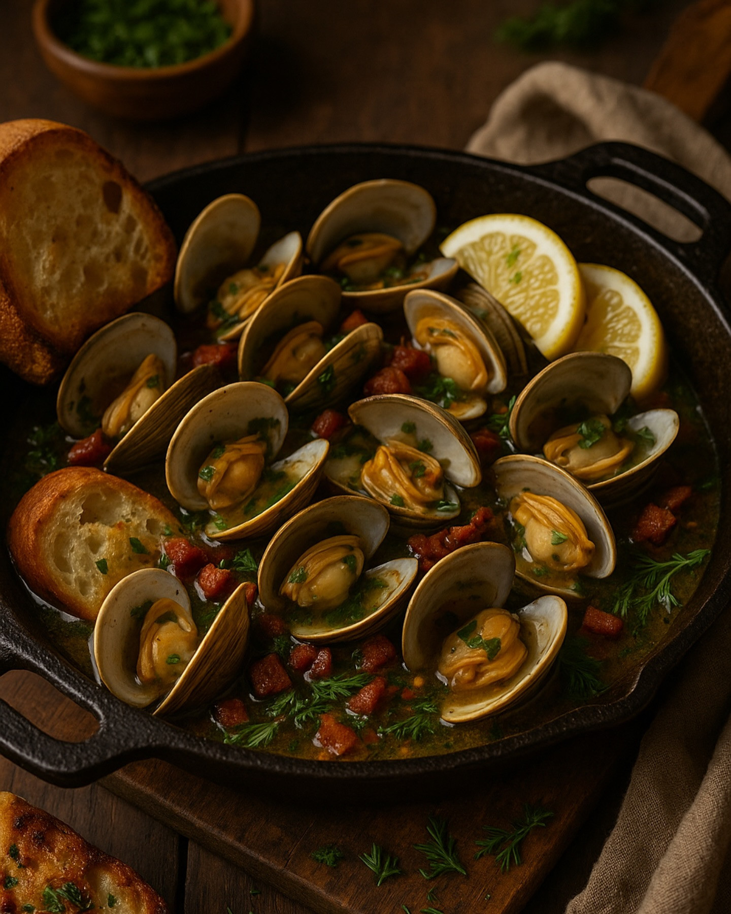 Instructions 1. Crisp the chorizo – Heat the olive oil in a wide cast-iron skillet over medium. Add the diced chorizo and sauté 2–3 min until the fat renders and the edges brown. Push the chorizo to one side of the pan. 2. Build the base – Melt 2 Tbsp butter in the open space. Add the garlic; cook 30 sec until fragrant. Pour in the wine, stock and red-pepper flakes. Bring to a lively simmer. 3. Steam the clams – Scatter the clams into the bubbling liquid, cover with a tight lid and cook 4–6 min, shaking once or twice, until most shells pop open (discard any that stay closed). 4. Finish – Remove the lid. Stir in the remaining 1 Tbsp butter, parsley, dill and lemon juice. Taste the broth and adjust salt if needed. 5. Serve – Set the skillet in the centre of the table, sprinkle extra herbs on top and add lemon wedges. Hand everyone bread to mop up the smoky, buttery broth.
