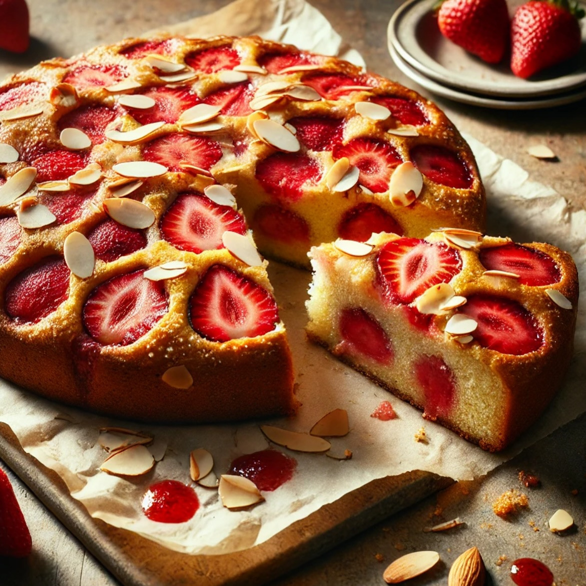 Instructions: 1. Preheat oven to 350°F (175°C). Grease and line an 8-inch cake pan. 2. In a bowl, whisk flour, baking powder, and salt. 3. In another bowl, cream butter and sugar until light. Beat in eggs one at a time, then vanilla. 4. Mix in sour cream, then fold in dry ingredients until just combined. 5. Spread batter in pan, top with strawberries and almonds, sprinkle with coarse sugar if using. 6. Bake 40–45 min until golden and a toothpick comes out clean.