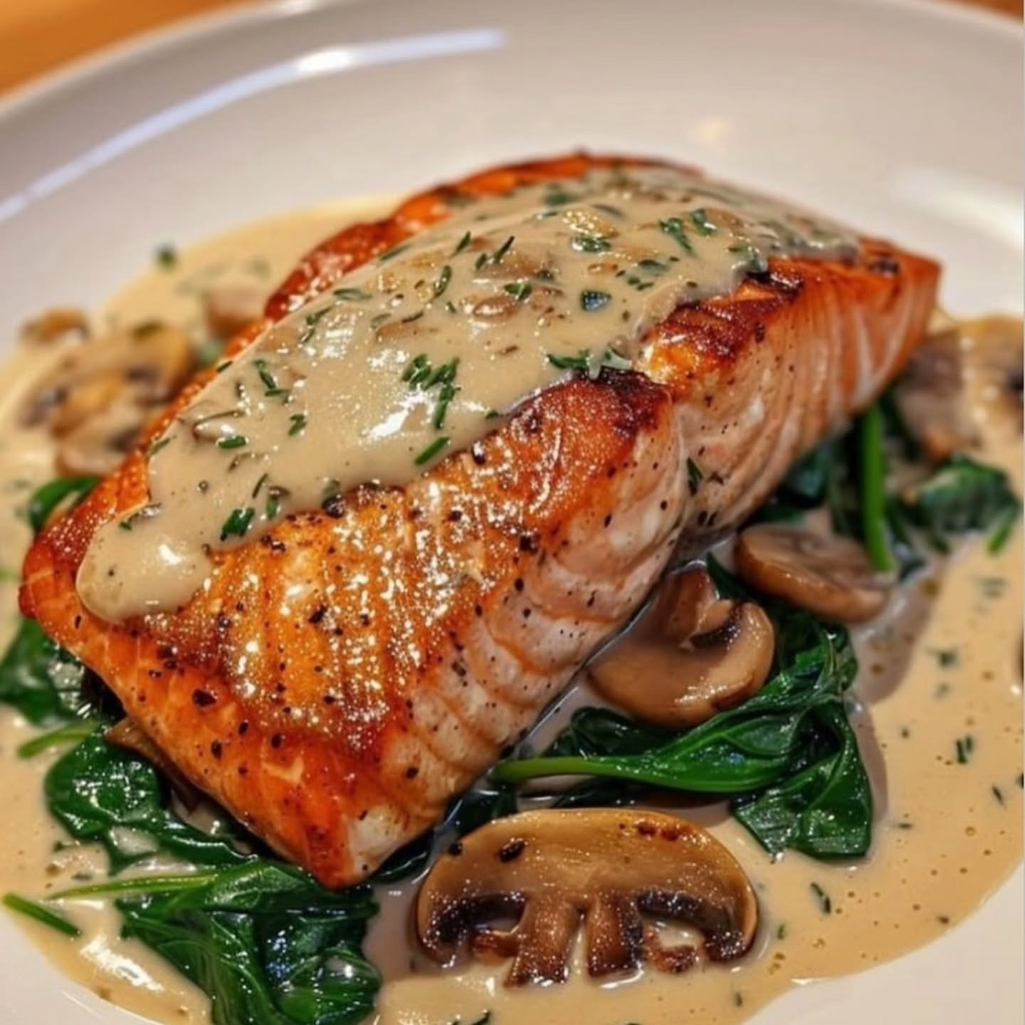 🌿🍣Salmón a la Sartén con Salsa de Champiñones y Espinacas Ingredientes 2 filetes de salmón fresco. 1 cucharada de aceite de oliva. 200 g de champiñones (laminados). 1 taza de espinacas frescas (lavadas). 1 diente de ajo (picado). 1/4 taza de caldo de pollo o verduras. Sal y pimienta al gusto. Perejil fresco picado (opcional). Preparación 1. Cocinar el salmón: Sazona los filetes con sal y pimienta. Frielos en una sartén con aceite de oliva durante 3-4 minutos por lado, o ásalos en el horno a 200°C por 12-15 minutos. Hacer la salsa: En la misma sartén, sofríe el ajo y los champiñones hasta que estén dorados. Agrega el caldo, las espinacas, sal y pimienta. Cocina hasta que las espinacas se suavicen (2-3 minutos). Servir: Coloca el salmón en un plato y cubre con la salsa de champiñones y espinacas. Decora con perejil fresco si deseas. Este plato de salmón con champiñones y espinacas es una explosión de nutrientes para tu cuerpo. Rico en omega-3, antioxidantes y fibra, fortalece tu corazón, cerebro, huesos y sistema inmunológico. Además, apoya la salud digestiva, mejora la energía y combate la inflamación. Una receta deliciosa y saludable que cuida de ti por dentro y por fuera.