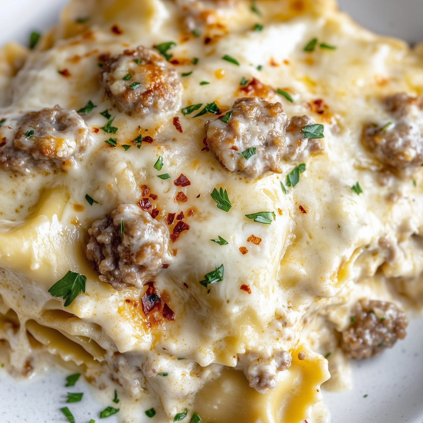 Assemble Lasagna: In a greased 9x13" dish, spread a layer of Alfredo. Add half the ravioli, half the ricotta mix, half the sausage, and a bit more Alfredo. Repeat layers. Top with mozzarella and Parmesan.