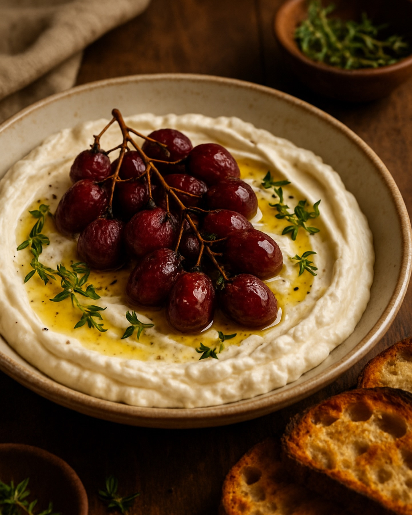 For the roasted grapes: • 1 ½ cups red or black seedless grapes • 1 tsp olive oil • 2–3 sprigs fresh thyme • Pinch of sea salt