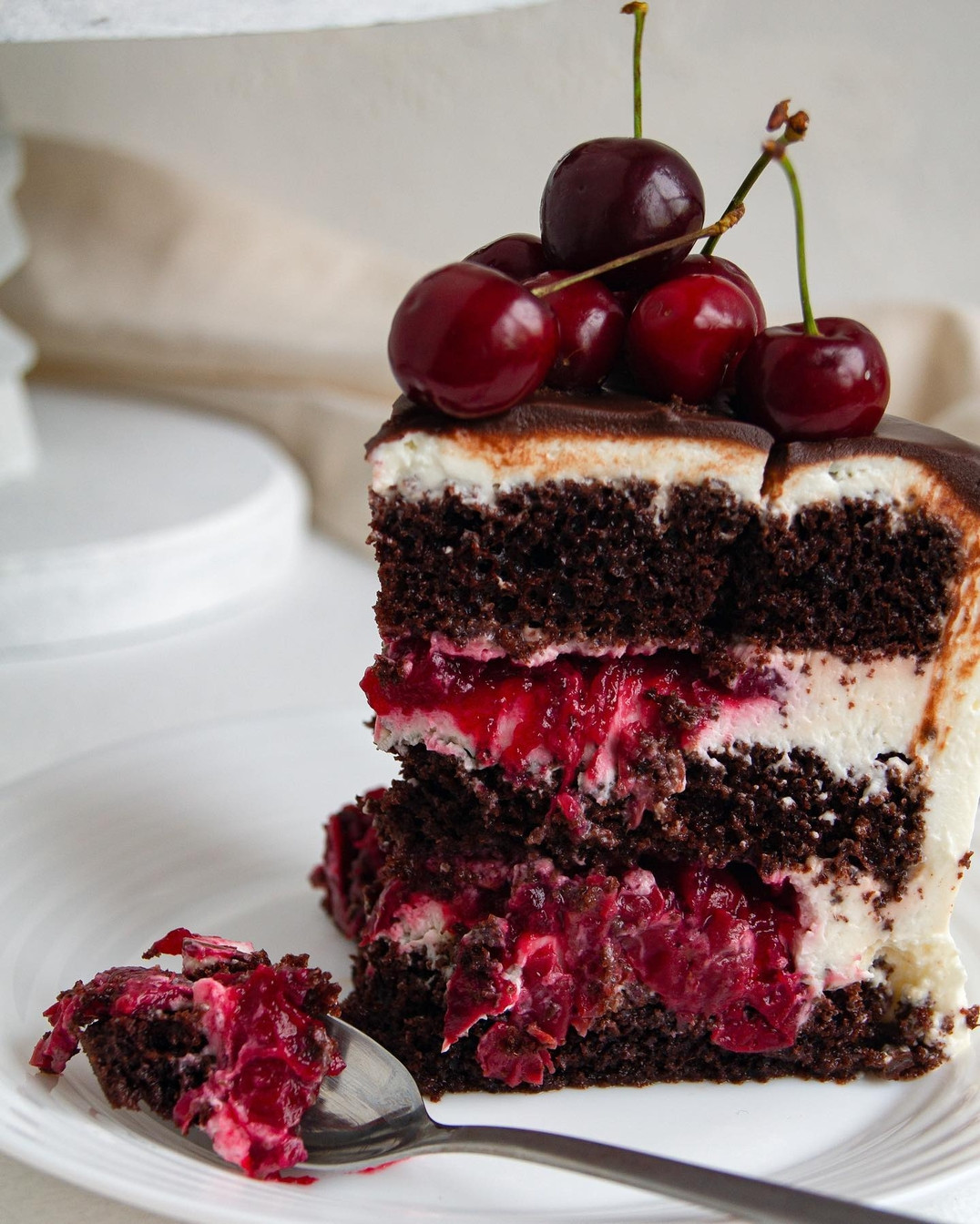 Рецепт торта «Вишня-Шоколад» рубрика - t.me/Cakedeco автор - @azimova_natalia 🔶Шоколадные коржи (диаметр 16 см) Мука - 170 гр Какао - 45 гр Сахар - 190 гр Яйца - 180 гр Молоко - 130 гр Растительное масло - 50 гр Разрыхлитель- 6 гр Сода - 3 гр ⠀ Смешать и просеять сухие ингредиенты. В отдельной чаше смешать масло и молоко. Яйца с сахаром взбить до пышной, светлой массы. На минимальной скорости ввести по 1/3 части сухих и жидких, повторяя процесс пока не закончатся ингредиенты. Выпекать при температуре 160 градусов 40-60 минут, в форме 16 см. Готовность проверяем шпажкой, убрать в холодильник на 6-8 часов, предварительно обернув пленкой. Разрезать на 3 коржа (шапочку срезать) ⠀ 🔶Вишневое конфи (на крахмале) 300 гр вишни 60 г сахара 20 гр воды 20 г кукурузного крахмала ⠀ Замороженную вишню помещаем в сотейник, добавляем сахар. Прогреваем, чтобы вишня растаяла и пустила сок, а сахар растворился. Смешиваем крахмал с холодной водой, сразу выливаем к вишне, постоянно перемешивая. Доводим до кипения, прогреваем еще 1-2 минуты, не переставая помешивать, снимаем с огня. Накрываем пленкой в контакт (или переложить в кондитер.мешок) - остужаем до комнатной температуры, после убрать в холодильник ⠀ 🔶Крем чиз на сливках с шоколадной крошкой: 400 гр творожного сыра 100 гр сливок 33-35% 120 гр сахарной пудры 25 гр тёмного шоколада (по желанию, можно без него сделать крем) ⠀ Взбить ингредиенты до однородной и плотной массы (Сливки и сыр обязательно холодные). В кондитерский мешок, убираем шоколад: топим его в микроволновке или в стакане с горячей водой. Отрезаем маленькое отверстие в мешке и наносим на крем сеточкой, ждём когда шоколад станет матовым (можно убрать в холод) и перемешиваем (насадка весло или лопаткой), повторяем действия пока не закончится шоколад. ⠀ 🔶Молочная пропитка 60 гр молока 90 гр воды 90 гр сахара ⠀ Все ингредиенты собрать в сотейнике, довести до кипения и полного растворения сахара. ⠀ 🔹Сборка: корж-пропитка-крем-конфи -корж-пропитка-крем-конфи- корж-пропитка.