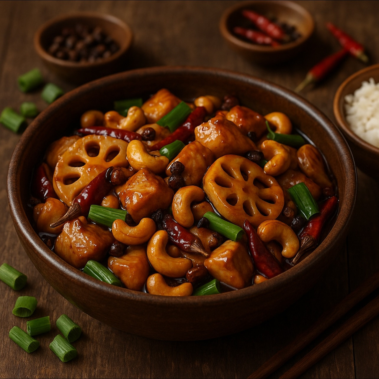 A bold twist on the Chinese classic: tender chicken stir-fried with lotus root, roasted cashews, dried chilies, Sichuan peppercorns, and scallions — spicy, nutty, and incredibly aromatic.
