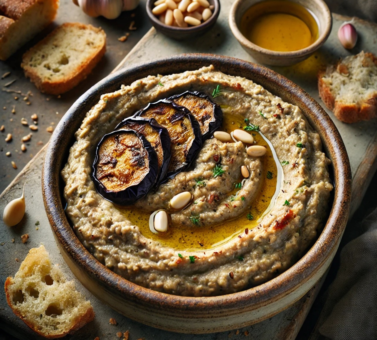 🔥 Instructions: 1. Roast the vegetables: Prick eggplants with a fork. Wrap garlic bulb in foil. Roast both at 400°F (200°C) — eggplant for ~40 min until collapsed; garlic for ~30 min until soft. 2. Scoop & mash: Scoop eggplant flesh into a bowl. Squeeze in the roasted garlic. Add olive oil, lemon juice, tahini (if using), and salt. Mix roughly with a fork or spoon — keep the texture uneven and honest. 3. Serve rustic: Spoon into a rough ceramic bowl. Drizzle more olive oil on top. Scatter pine nuts if you like. Tear bread, dip messy, enjoy loud.