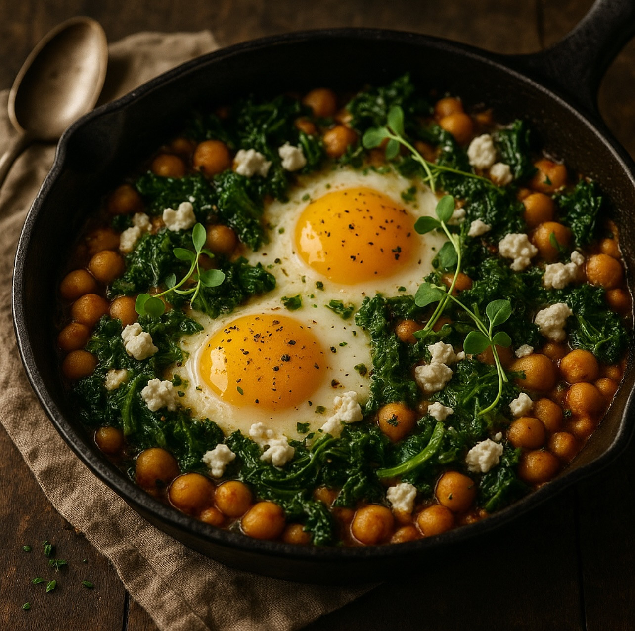 Instructions 1. Sauté base – Warm olive oil in a small cast-iron skillet over medium heat. Add onion; cook 3 min until soft. Stir in garlic, paprika & cumin; cook 30 s fragrant. 2. Simmer sauce – Pour in crushed tomatoes and chickpeas. Season with salt & pepper. Simmer 5 min, then fold in kale until wilted. 3. Poach eggs – Make two wells; crack an egg into each. Cover skillet, reduce heat to low, and cook 5–7 min until whites set but yolks are still runny. 4. Finish – Sprinkle feta and micro-greens. Grind fresh pepper on top. Scoop up with warm bread!