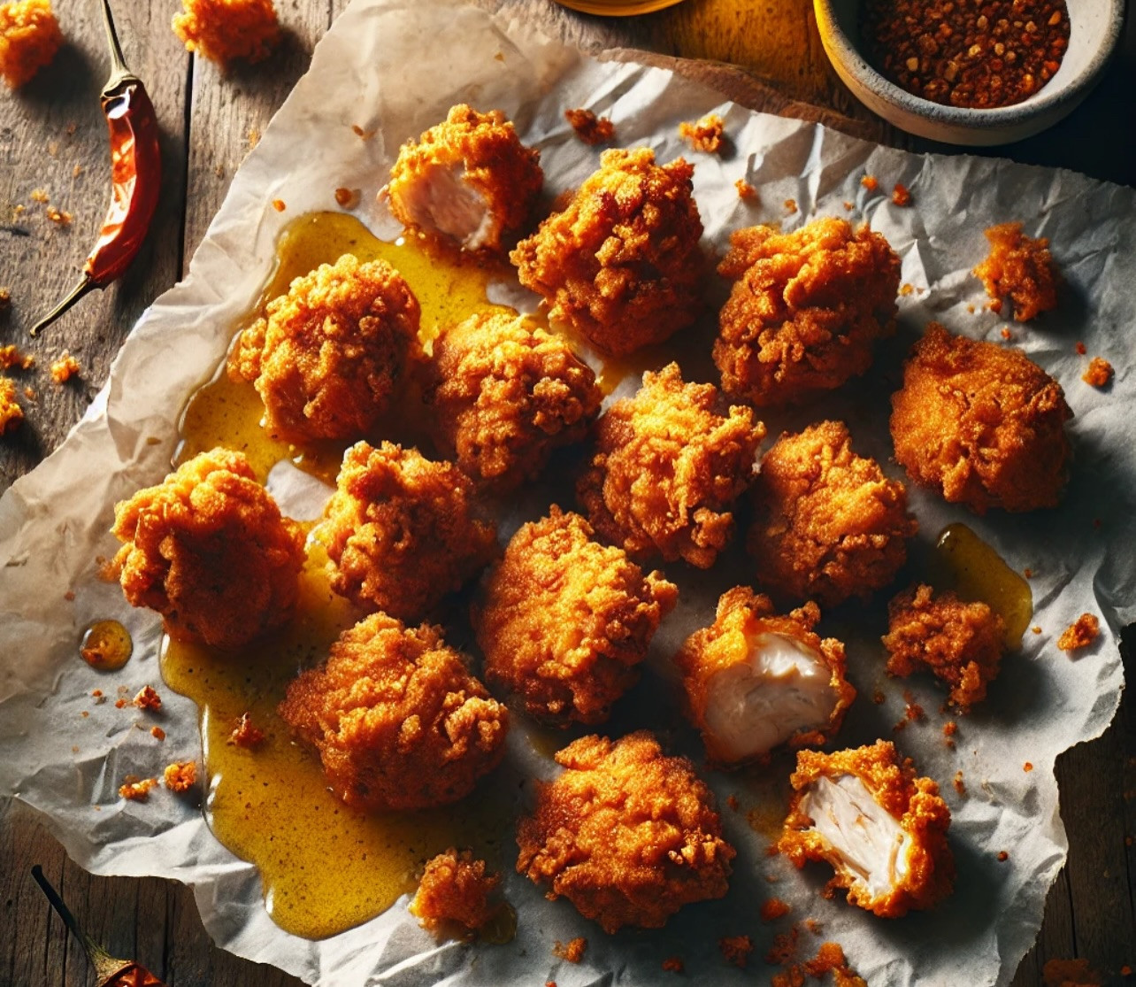 This isn’t basic fried chicken. These chunks are marinated in buttermilk, garlic and harissa, then fried until golden and uneven — with a kick of heat and a deep, slightly smoky flavor. They’re rustic. Crunchy. Sticky. And wildly addictive.
