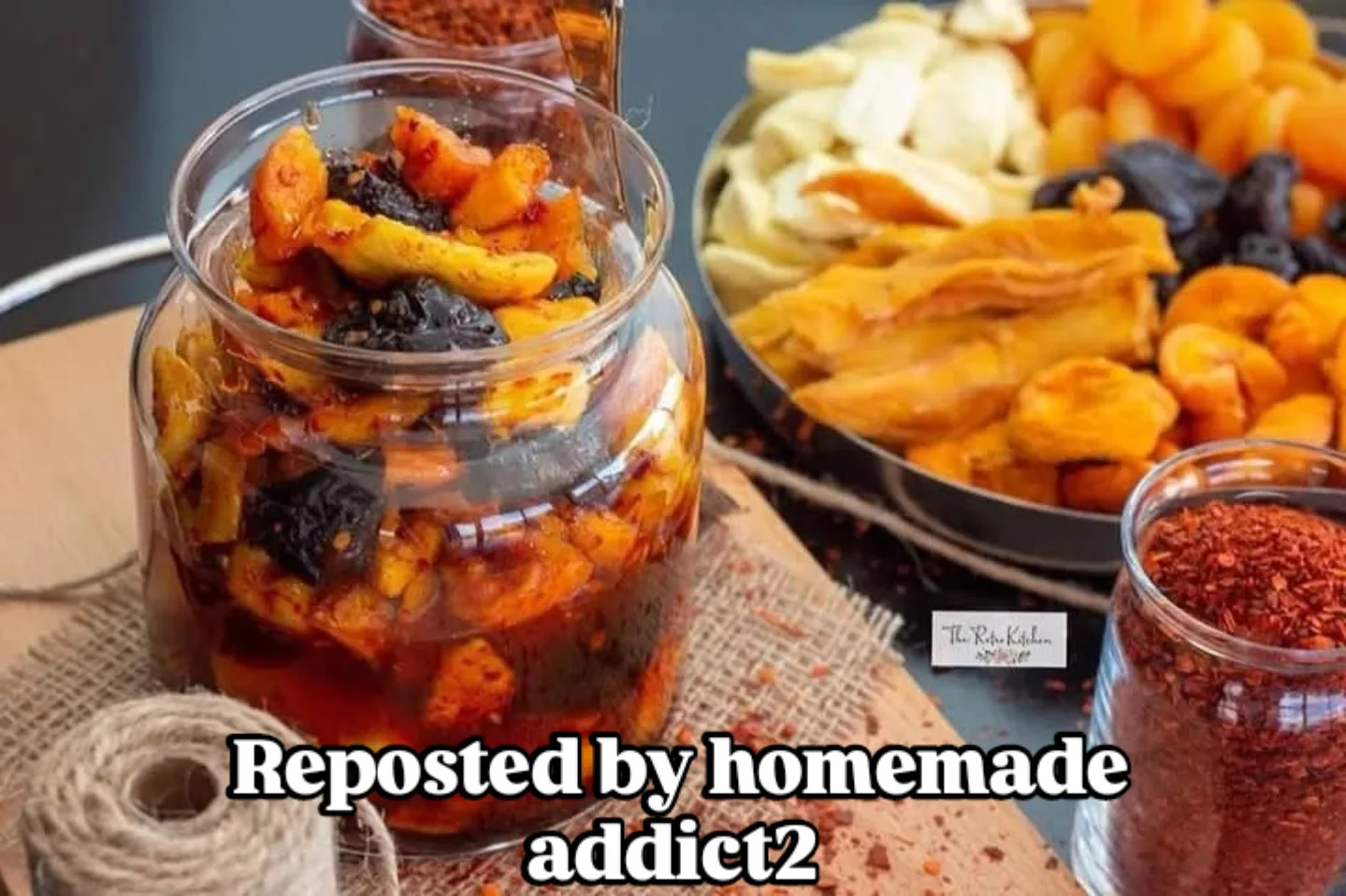 Dry fruit atchaar Recipe credit : @theretrokitchen @homemade_addict2 1 and 1/2 kg fruit 3 cups sugar 1 and 1/2 cups water 2 cups vinegar 2 taj sticks 2 cloves Few strands of saffron 1/2 cup crushed chili flakes 1/2 cup methi masala 2 Tbs oil 1 Tbs thill (optional) Cut fruit into smaller pieces. Make a sticky syrup with the water, sugar, taj sticks, cloves, saffron and vinegar. When done and still hot add to your fruit. After about 10 minutes mix in your chili flakes and methi masala.