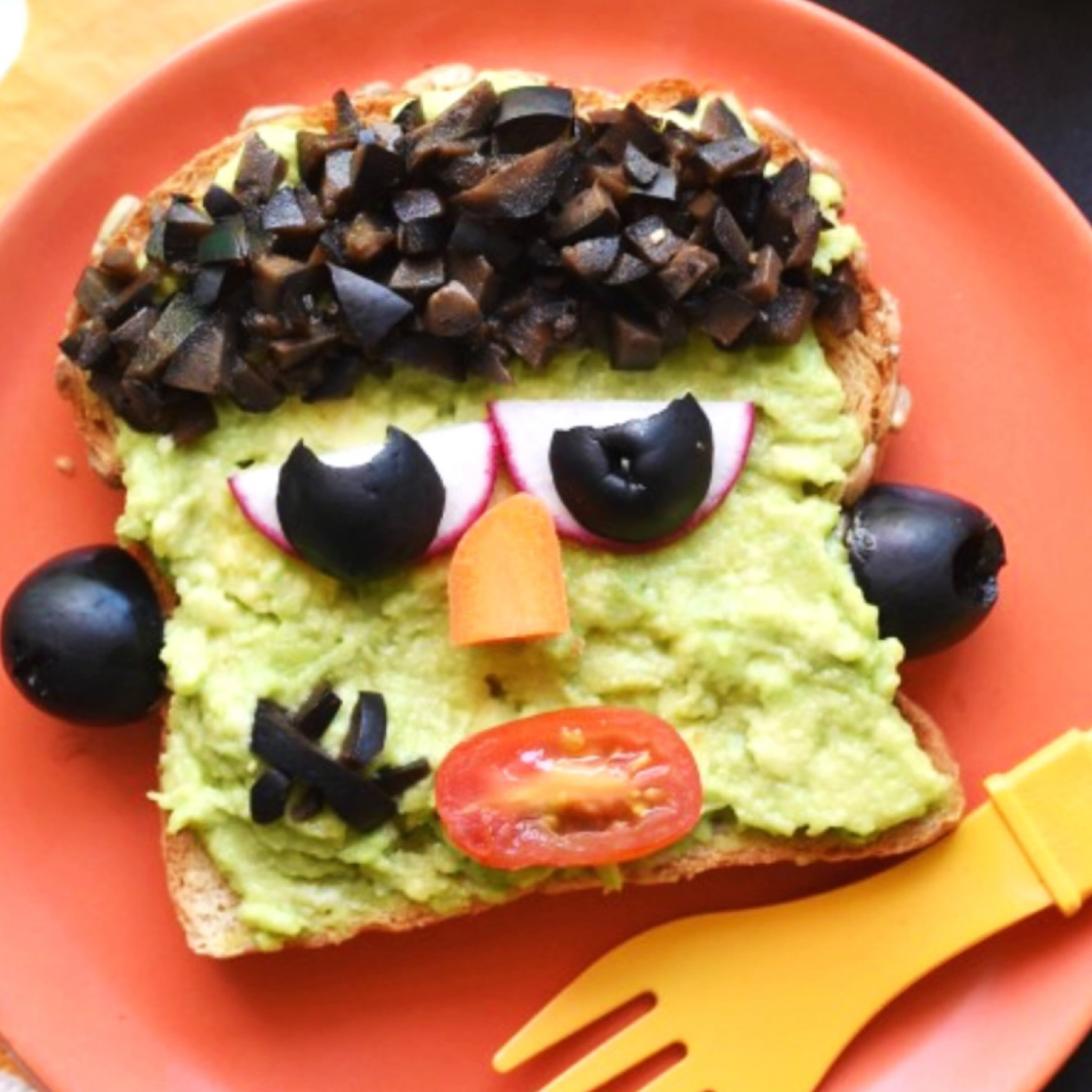 Instructions: 1. In a bowl, beat eggs. 2. In another bowl, mix milk, food coloring, cinnamon, and nutmeg. 3. Warm a griddle over medium-high heat and spray with nonstick cooking spray. 4. Dip bread into eggs, then into milk mixture, and place on griddle. 5. Turn heat down to medium and cook 4–5 minutes per side, until golden (and green!). 6. Once cooled slightly, decorate into monster faces: • Use the top ½–1 inch of the toast as hair or Frankenstein’s flat top. Fill in loosely with gel, then top with blueberries. • Place two gel dots near the center for eyes, top with blueberries. • Draw on a mouth, scars, or stitches with gel.