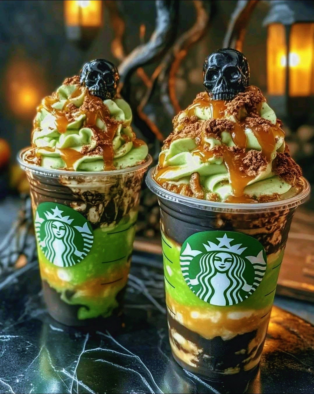 Top & garnish: Add whipped cream, candied apple shards, caramel drizzle, and finish with a chocolate skull charm
