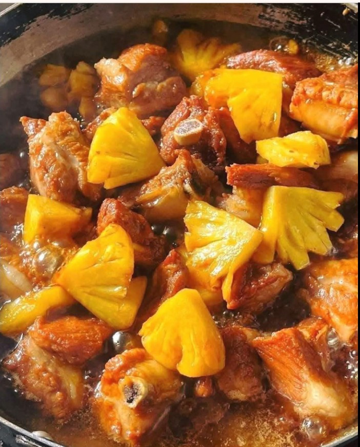 3. Kho sườn: Làm nóng chảo với dầu ăn, phi thơm chút hành tỏi, cho sườn vào xào sơ cho đến khi săn lại. Sau đó, thêm dứa vào, đảo đều. Thêm một ít nước (khoảng 1-2 chén), đậy nắp và nấu nhỏ lửa trong khoảng 30-40 phút cho đến khi sườn và dứa mềm và thấm đều gia vị.