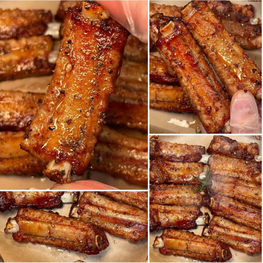 📌 Cách làm: 1. Sườn rửa sạch, để ráo. 2. Ướp sườn với: - 1 muỗng tỏi băm - 2 muỗng nước tương - 1 muỗng dầu hào - 1 muỗng rượu nấu ăn - 1 muỗng nước tương đậm - 1 muỗng bột bắp - 1 muỗng mật ong - ít tiêu đen 3. Trộn đều và ướp **ít nhất 1 giờ** (ngon hơn nếu để qua đêm). 4. Xếp sườn vào nồi chiên không dầu, nướng ở **180°C trong 15 phút**. 5. Trở mặt sườn, nướng tiếp khoảng **8 phút** cho chín đều và vàng thơm.