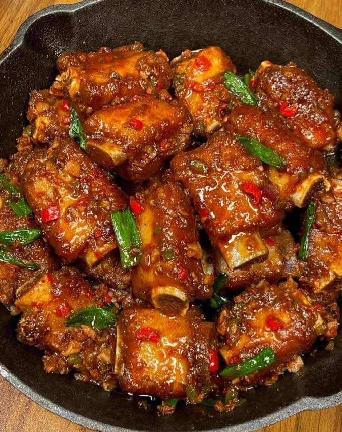 Sườn ram tỏi ớt * Chuẩn bị nguyên liệu: - Sườn, ớt, hành tây, tỏi, bột ớt, bột thì là, bột nướng - Gia vị: đường, nước mắm, muối * Cách chế biến: 1. Sườn mua về rửa sạch rồi luộc sơ qua cũng với hành gừng để khử mùi hôi. Luộc xong thì đổ sườn ra rồi rửa sạch lại, để cho ráo nước 2. Cho sườn vào chiên hơi xém xém một chút thì gắp ra 3. Cho một chút dầu vào chảo, cho ớt xanh ớt đỏ, hành tây, tỏi băm, bột ớt, bột thì là, bột nướng, đảo đều lên cho thơm rồi đổ sườn vào. Nêm thêm 2 thìa nước mắm, ½ thìa muối, 1 thìa đường 4. Đảo đều tay cho sườn ngấm gia vị rồi cho hành lá vào nữa là xong