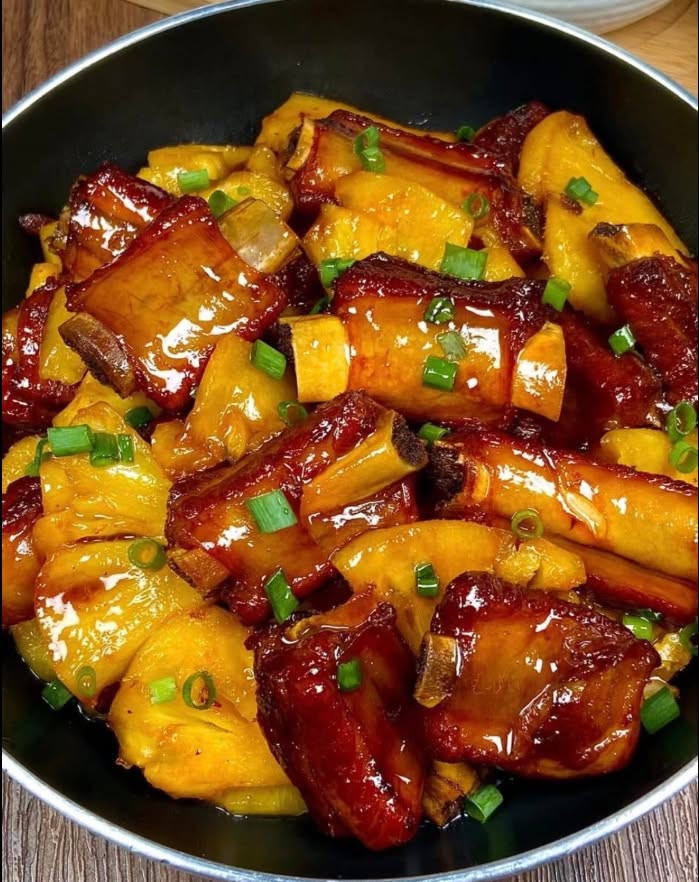 Sườn kho dứa Chuẩn bị nguyên liệu : - Sườn 400gr - Tỏi 30gr - Hành tím 30gr - Hành lá 2 nhánh - Ớt sừng 1 quả - Dứa 1/2 quả - Gia vị: đường, muối, hạt nêm, nước mắm, tiêu xay . Cách Chế biến : 1 . Sườn ngâm nước muối, rửa sạch, cắt khúc thành miếng vừa ăn. Dứa gọt vỏ, khứa mắt , rửa sạch . Rửa hành tím, hành lá, ớt sừng , tỏi . - Hành tím, hành lá, ớt sừng băm nhỏ, hành lá cắt dài tầm 2cm . 2 . Sau khi sơ chế sườn , cho vào bát lớn . Ướp sườn với nửa muỗng canh hạt nêm, 2 muỗng canh đường, nửa muỗng canh muối, 4 muỗng canh nước mắm, 10 gram tiêu xay, nửa phần hành tím băm, tỏi và ớt băm. Trộn các gia vị và thịt lại với nhau, ướp thịt trong vòng khoảng 30 - 40 phút cho sườn thấm gia vị. 3 . Cho dứa vào bát thêm 1 muỗng canh đường, ⅓ muỗng cà phê muối, trộn cho hỗn hợp thấm đều , để tầm 15 phút cho thấm gia vị. - Chuẩn bị 1 cái chảo, bắc chảo lên bếp , cho phần dứa đã ướp gia vị vào , để lửa nhỏ trong 10 phút, đến khi nào dứa vừa chín là được . 4 . Đun nóng dầu trong chảo cho hành , tỏi, ớt vào phi thơm. Tiếp đó cho sườn đã ướp vào , đảo đều ở lửa lớn cho săn thịt và chín , đổ 300 ml nước lọc vào. - Nấu cho nước sôi trở lại thì vặn nhỏ l.ửa , đậy nắp rim trong 30 phút . Đến khi thịt thấm đều gia vị thì cho dứa đã rim , hành lá cắt khúc, ớt sừng băm và tiêu xay vào rồi tắt bếp . Cuối cùng cho ra dĩa & thưởng thức . Ẩn bớt