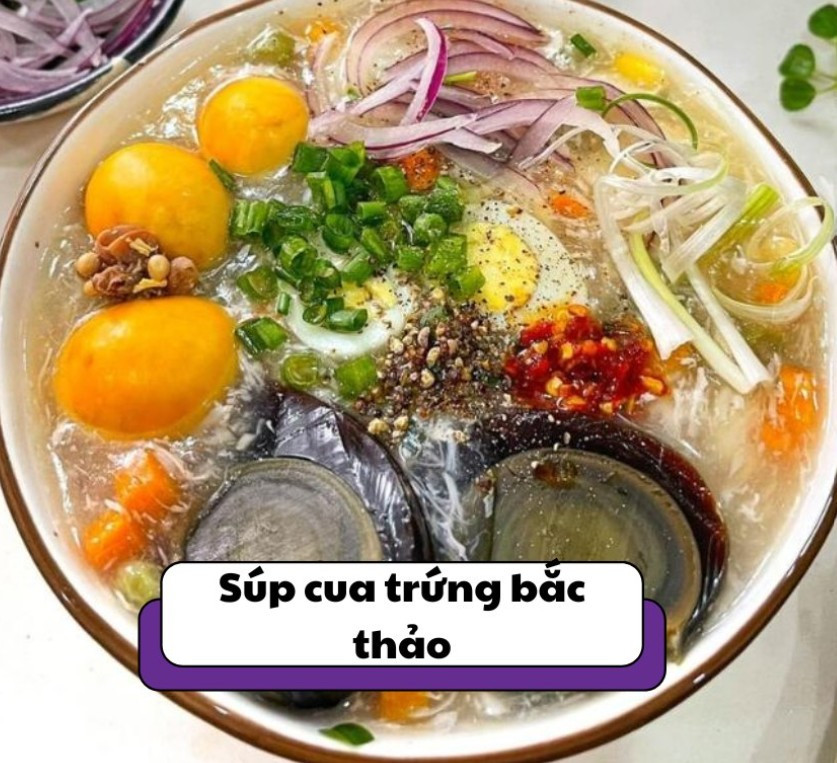 Súp cua trứng bắc thảo Nguyên liệu: 200g thịt cua 1 quả trứng bắc thảo 2 quả trứng gà 1 thìa bột năng 500ml nước dùng gà Muối, tiêu, hành lá Cách làm: Trứng bắc thảo bóc vỏ, cắt nhỏ. Đun sôi nước dùng gà, cho thịt cua vào nấu chín. Hòa bột năng với nước, cho vào nồi khuấy đều đến khi súp sánh. Đánh tan trứng gà, rưới từ từ vào nồi để tạo sợi trứng. Thêm trứng bắc thảo, nêm muối, tiêu, hành lá và thưởng thức.