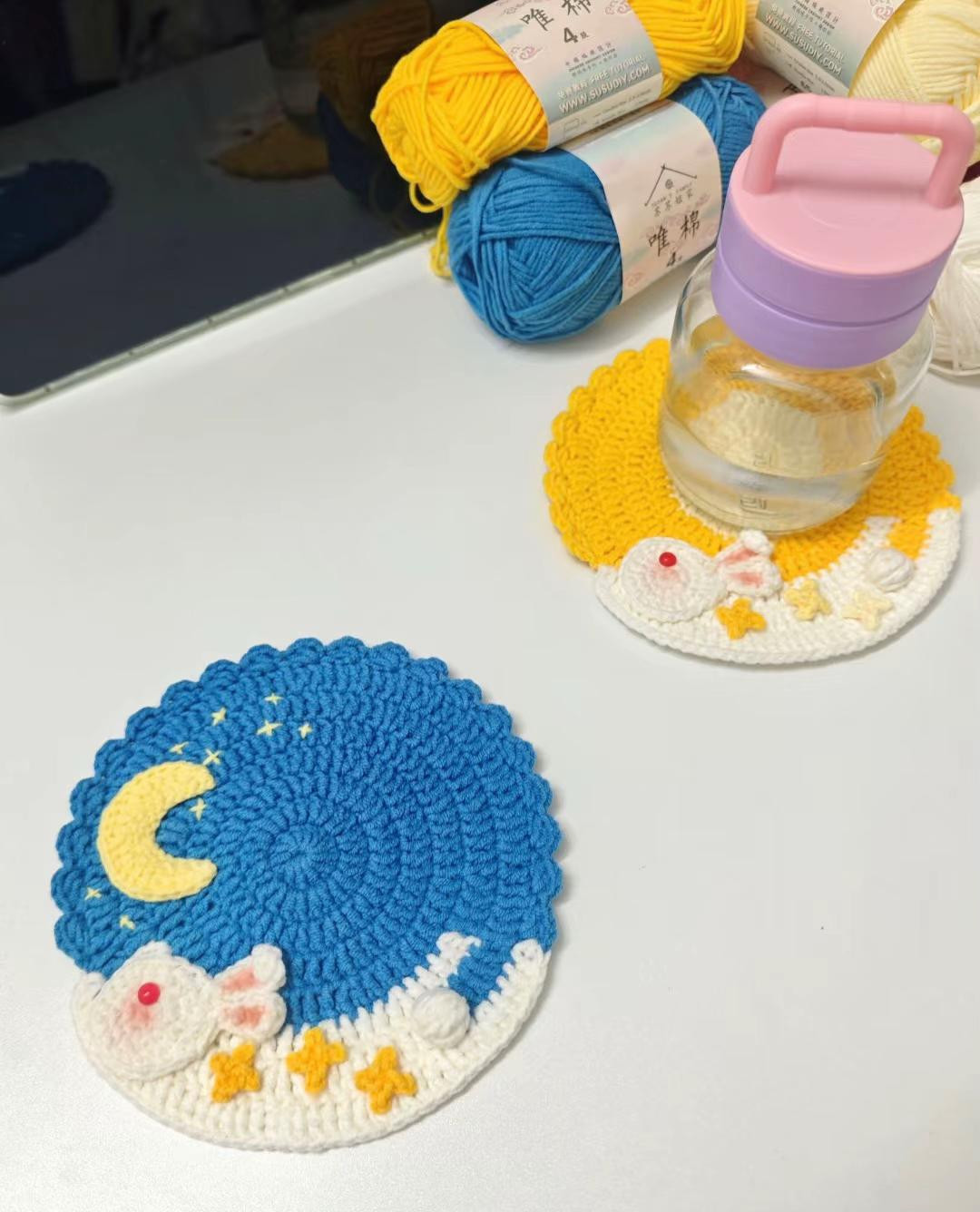 Tấm lót ly hình chú thỏ dưới trăng bằng len móc sáng tạo