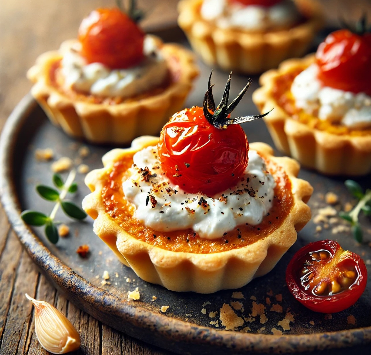 🔥 Instructions: 1. Make the crust: Blend flour, salt, and butter until crumbly. Add ice water until dough comes together. Chill 30 min, then press into small tartlet molds or muffin tins. Bake blind at 375°F (190°C) for 12–15 min. 2. Whip the filling: In a bowl, combine goat cheese, cream cheese/yogurt, salt and pepper. Whip until fluffy. 3. Roast the tomatoes: Toss tomatoes with olive oil, garlic, and a pinch of salt. Roast at 400°F (200°C) for 15–20 min until blistered and sweet. 4. Assemble: Spoon whipped goat cheese into cooled tart shells. Top each with a few roasted tomatoes. Serve warm or room temp.