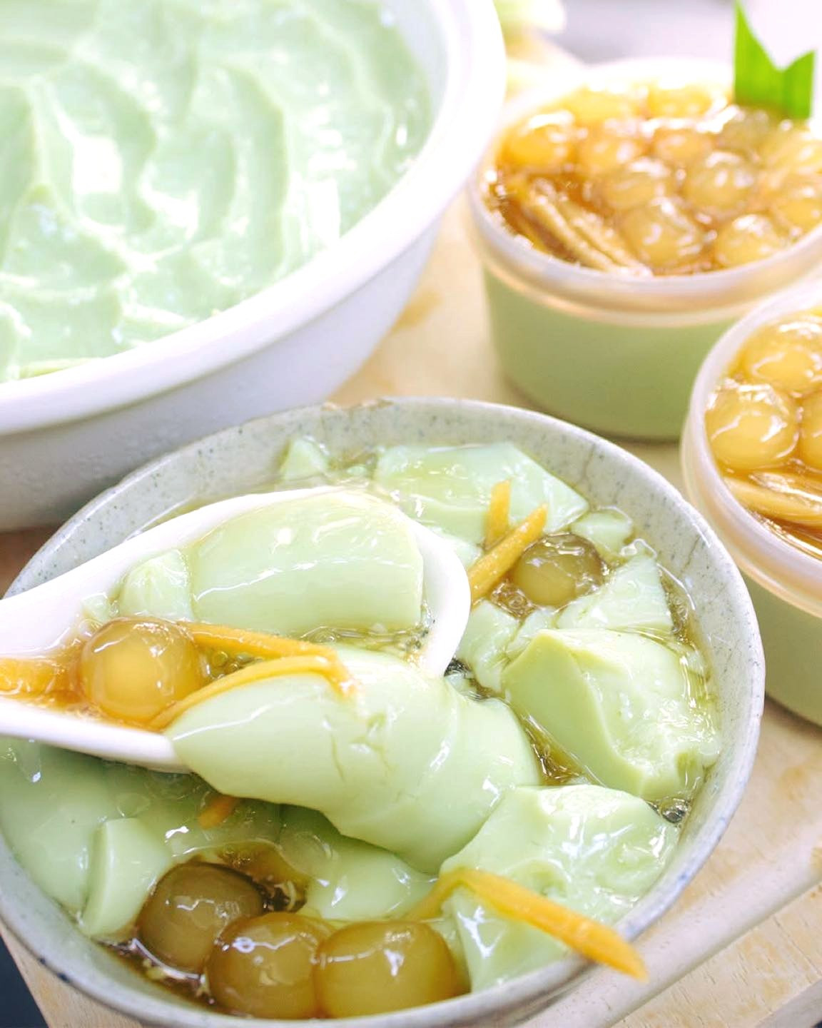 QUÁ BẤT NGỜ VỚI CÔNG THỨC NẤU TÀU HŨ LÁ ĐƯA CỰC KỲ THƠM NGON MÀ DỄ LÀM Nguyên liệu: 2L sữa đậu nành 10 lá gelatin 150g đường thốt nốt 100g gừng Xay lá dứa: 30g lá dứa, 300ml nước Trân châu: 2v bột năng, 1v nước sôi Cách làm: - Lá dứa rửa sạch, cắt nhỏ. Cho lá dứa vào máy xay sinh tố, xay nhuyễn với 300ml nước. Đổ nước lá dứa qua ray rồi cho vào ngăn mát tủ lạnh để qua 1 đêm. Chắt từ từ bỏ đi phần nước trong ở trên, chỉ giữ lại phần tinh chất màu xanh lắng bên dưới - Ngâm gelatin với nước lạnh 2 - 3 phút. Vớt gelatin ra, để ráo nước. - Đổ sữa đậu nành vào nồi, nấu lửa nhỏ. Khi sữa đậu nành sôi sủi tăm thì cho nước lá dứa và gelatin vào. Khuấy đều 1 lúc cho gelatin tan hết. Múc tàu hủ lá dứa cho vào khuôn, để nguội rồi cho vào ngăn mát tủ lạnh 3 - 4 tiếng. - Trộn từ từ nước sôi vào bột năng, đến khi có thể nhồi thành khối được thì nhồi vài phút cho bột dẻo mịn. Chia bột ra rồi lăn dài, xắt thành từng viên nhỏ. Vo tròn viên trân châu rồi cho vào thau bột năng (để trân châu không bị dính) - Bắt lên bếp nồi nước sôi, cho trân châu vào luộc. Khi trân châu nổi lên thì vặn nhỏ lửa, đậy hé nắp nồi và tiếp tục luộc 30 phút - 1 tiếng. Tắt bếp, để trân châu trong nồi thêm 30 phút. - Nấu đường thốt nốt cho lên màu vàng caramel thì cho gừng vào. Đảo 1 lúc cho gừng dậy mùi thơm, thì cho nước, 1 bó lá dứa và phần trân châu đã luộc vào. Nấu thêm 10 - 15 phút cho nước đường hơi sánh lại. - Lấy tàu hủ lá dứa ra khỏi tủ lạnh (phần chưa ăn cứ để trong tủ, không để cùng nước đường). Chang nước đường gừng và thêm trân châu. Tàu hủ này chỉ có thể ăn lạnh. chúc cả nhà thành công với cách làm trên nhé.