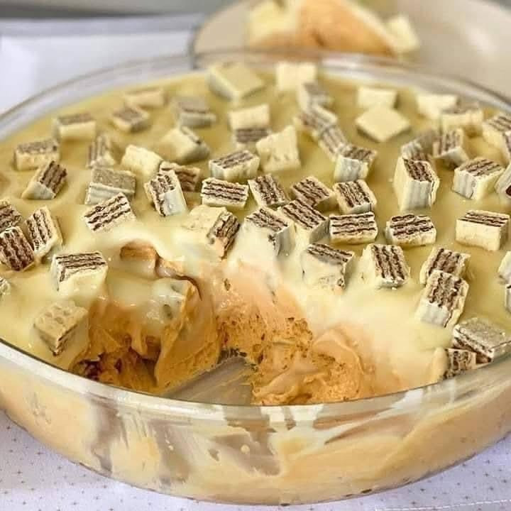 - Bata 500 ml de creme de leite fresco (ou chantilly) na batedeira até dobrar de volume, adicione 5 colheres de sopa rasas de doce de leite e misture delicadamente. - Pegue uma travessa e faça camadas, uma camada de mousse de doce de leite, uma macada de bis branco picadinho.. (usei ao todo duas caixinhas de bis). Repita esse processo até acabar o mousse. - Derreta 200 gramas de chocolate branco no microondas por 2 minutos. Misture bem e despeje 200 gramas de creme de leite por cima. - Despeje a ganache por cima da sobremesa. geladeira por duas horas.