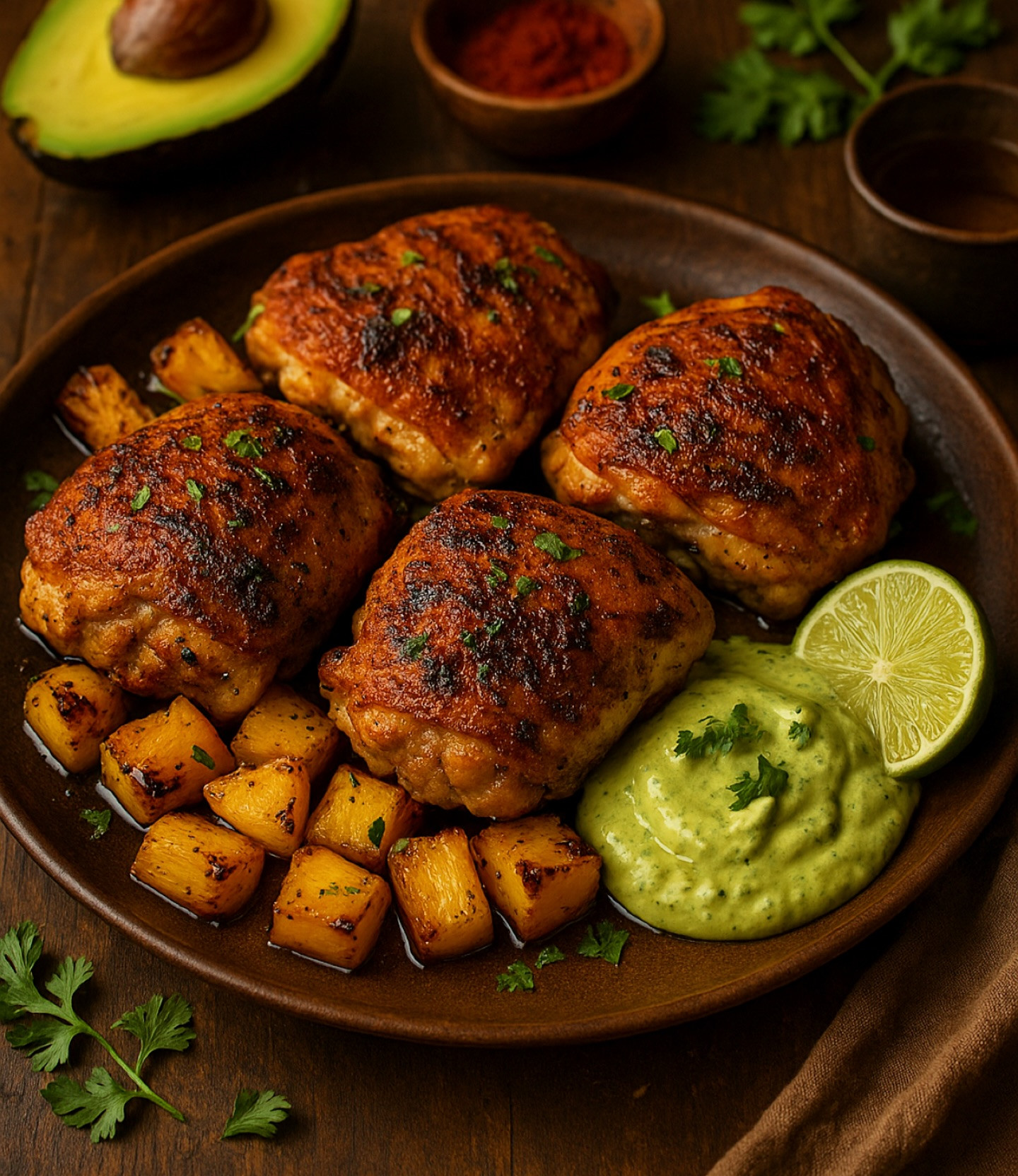 Bone-in thighs soak in a smoky tequila-lime marinade, sear to a deep golden crust, then finish in the oven beside caramelised pineapple chunks. A cool avocado-cilantro crema ties every sweet-heat bite together.