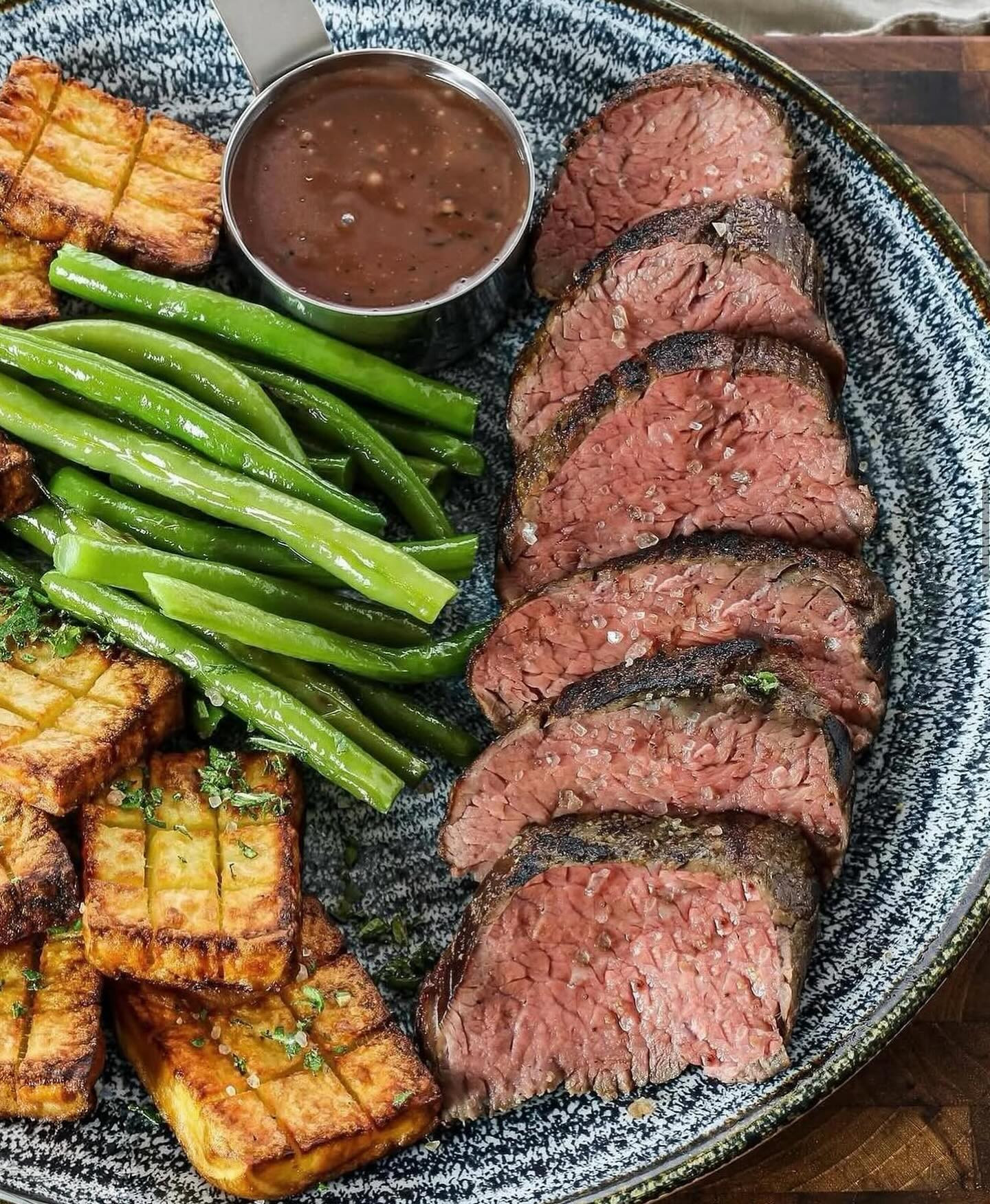 Teres Major served with #-potatoes, garlic sauteed haricot verts and a creamy red wine reduction.