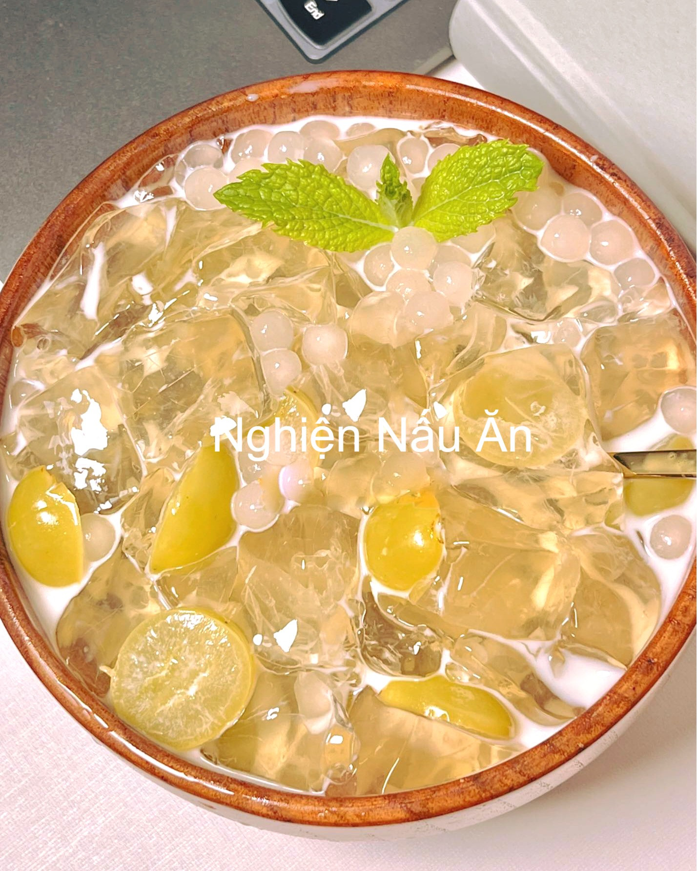 MÁCH BẠN CÁCH LÀM THẠCH Ô LONG NHO THANH MÁT GIẢI NHIỆT . Chuẩn bị nguyên liệu : - 1 chai trà ô long ( khoảng 250ml) - 3g bột rau câu dẻo - 20g đường - 10 trái nho xanh - Trân châu trắng - Nước cốt dừa Cách Chế biến : 1 . Trộn đường và bột rau câu . - Nho rửa sạch , cắt làm đôi , bỏ hạt , cho vào khuôn . 2 . Đổ trà ô long vào nồi , thêm hỗn hợp bột rau câu , khuấy đều & nấu đến khi sôi thì tắt bếp . 3 . Đổ hỗn hợp trên vào khuôn có nho , đợi nguội cho vào ngăn mát tủ lạnh trong 3-4h rồi lấy ra cắt miếng vừa ăn . 4 . Cho thạch nho vào bát , thêm trân châu trắng , nc cốt dừa và đá viên & thưởng thức . Chúc cả nhà thành công với công thức này nhé.