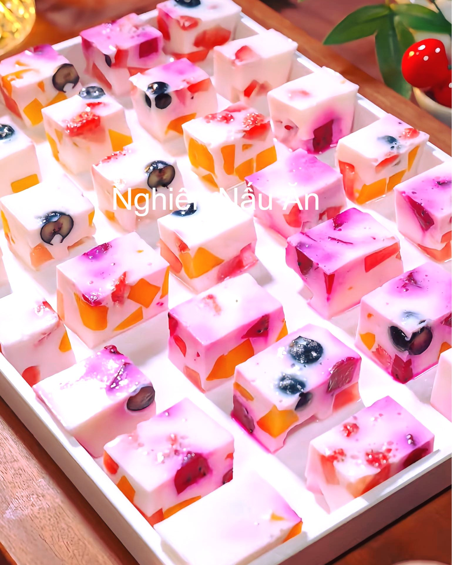 HƯỚNG DẪN CẢ NHÀ CÔNG THỨC LÀM THẠCH SỮA TRÁI CÂY NGON MÁT CỰC KỲ NGON . Chuẩn bị nguyên liệu : - 1 quả xoài - 1 quả thanh long ruột đỏ - 5 quả dâu - 5 quả nho - 500ml sữa tươi - 5g bột rau câu - 40g đường - 1 thìa sữa đặc Cách Làm : 1 . Trái cây rửa sạch , xắt nhỏ . 2 . Trộn đều đường và bột rau câu . 3 . Cho sữa tươi và sữa đặc vào nồi , nấu đến khi thấy bề mặt bốc hơi nóng thì cho hỗn hợp đường - bột rau câu vào , khuấy đều và nấu đến khi sôi lăn tăn thì tắt bếp . 4 . Cho trái cây xắt nhỏ vào khuôn , đổ hỗn hợp thạch sữa vào , đợi nguội cho vào ngăn mát tủ lạnh sau 4-5 tiếng lấy ra cắt miếng vừa ăn . Chúc cả nhà thành công với công thức này nhé.