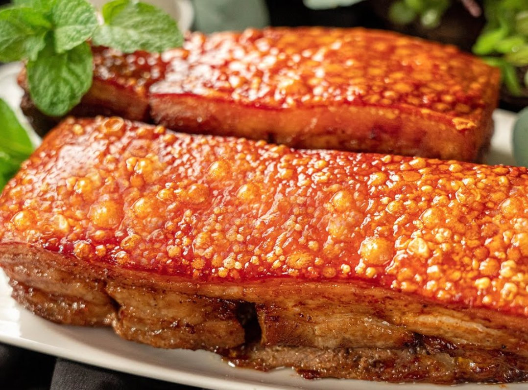 Cách làm: Dùng muối hạt bóp qua thịt heo để rửa sạch rồi cho vào nồi, đổ nước ngập mặt rồi đun sôi để làm chín phần bì. Vớt thịt ra rổ, để thịt nguội và ráo nước Tỏi, hành khô đập dập, thái to để thuận tiện vớt ra khi rán cho khỏi cháy Trộn 1 thìa canh rượu trắng, 1/2 thìa cafe gia vị, 1/2 thìa cafe đường, 1 thìa cafe ngũ vị hương, 1 chút hạt tiêu, cho vào khuấy tan. Ướp thịt vào hỗn hợp trên. Chú ý chỉ ướp phần thịt, phần bì quay lên trên để giữ khô nhé Dùng tăm nhọn hoặc dĩa đâm đều lên phần bì. Xâm càng nhiều và đều thì bì sẽ càng giòn. Xát đều vài hạt muối lên phần bì rồi dùng giấy ăn thấm qua cho khô. Cho thịt vào tủ lạnh để khoảng 4 -8 tiếng Trước khi mang thịt ra nước, phết 1 lớp nước chanh thật mỏng lên mặt bì sẽ giúp lớp bì nổ giòn hơn. Cho dầu vào chảo, cho thịt vào chiên, úp phần bì xuống trước nhé Khi thấy bì nổ vàng giòn thì lật mặt chiên tiếp phần dưới tới khi chín là được Thái thịt và bày ra đĩa! Đây chính là cách làm thịt quay giòn bì không cần lò nướng đơn giản nhất, lớp bì vàng ruộm, giòn tan, ngon không kém gì ngoài hàng. Ăn kèm rau sống và nước chấm chinsu đều được! Ẩn bớt Ẩn bớt