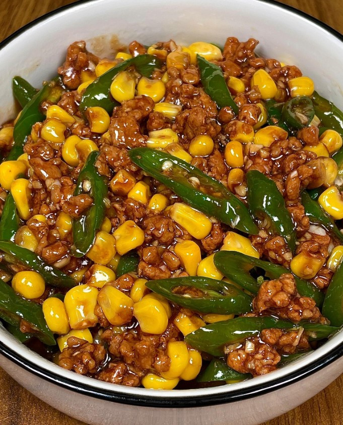 * Chuẩn bị nguyên liệu: - Thịt băm, ngô, ớt xanh - Gia vị: mắm, dầu hào, xì dầu, bột năng * Cách chế biến 1. Pha nước sốt: 1 thìa nước mắm, 1 thìa dầu hào, 1/2 thìa xì dầu, 1 thìa bột năng, 1/2 bát nước lọc rồi khuấy đều lên 2. Cho một chút dầu vào chảo rồi đổ thịt băm vào xào cho săn lại, cho thêm ngô vớt ớt xanh vào rồi đổ nước sốt vừa pha vào 3. Đảo đều tay cho ngấm đều gia vị rồi đun đến khi nước sốt sệt lại là xong