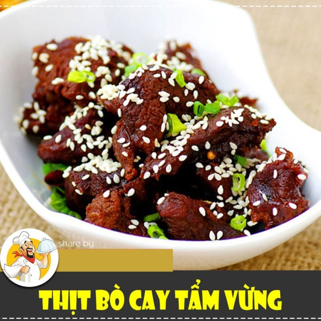 – Làm nóng chảo, cho hạt thì là vào xào thơm. Ớt khô bỏ cuống – Trút hạt thì là vào máy xay sinh tố xay nhuyễn cùng với ớt khô – Thịt bò rửa sạch, lọc bỏ mỡ và gân, cắt miếng quân cờ. Ướp thịt bò với 15ml nước tương, chút xíu muối, 10ml rượu nấu, bột tỏi và bột gừng (hoặc tỏi, gừng băm nhuyễn), trộn đều cho thịt bò thấm vị rồi bao kín bằng màng bọc thực phẩm, đặt vào ngăn mát tủ lạnh, để qua đêm hoặc 8 – 10 tiếng -Thịt bò đủ thời gian tẩm ướp, đem trần sơ qua nước sôi rồi vớt ra để ráo. Làm nóng dầu ô liu trong chảo, trút thịt bò vào chiên trên lửa lớn – Khi thịt bò săn lại là lúc bạn cho bột ớt + bột thì là vào. Đảo đều trong giây lát, trút vừng rang vàng, đảo lại lần nữa rồi tắt bếp. Bày thịt bò ra bát hoặc đĩa sâu lòng, dùng nóng