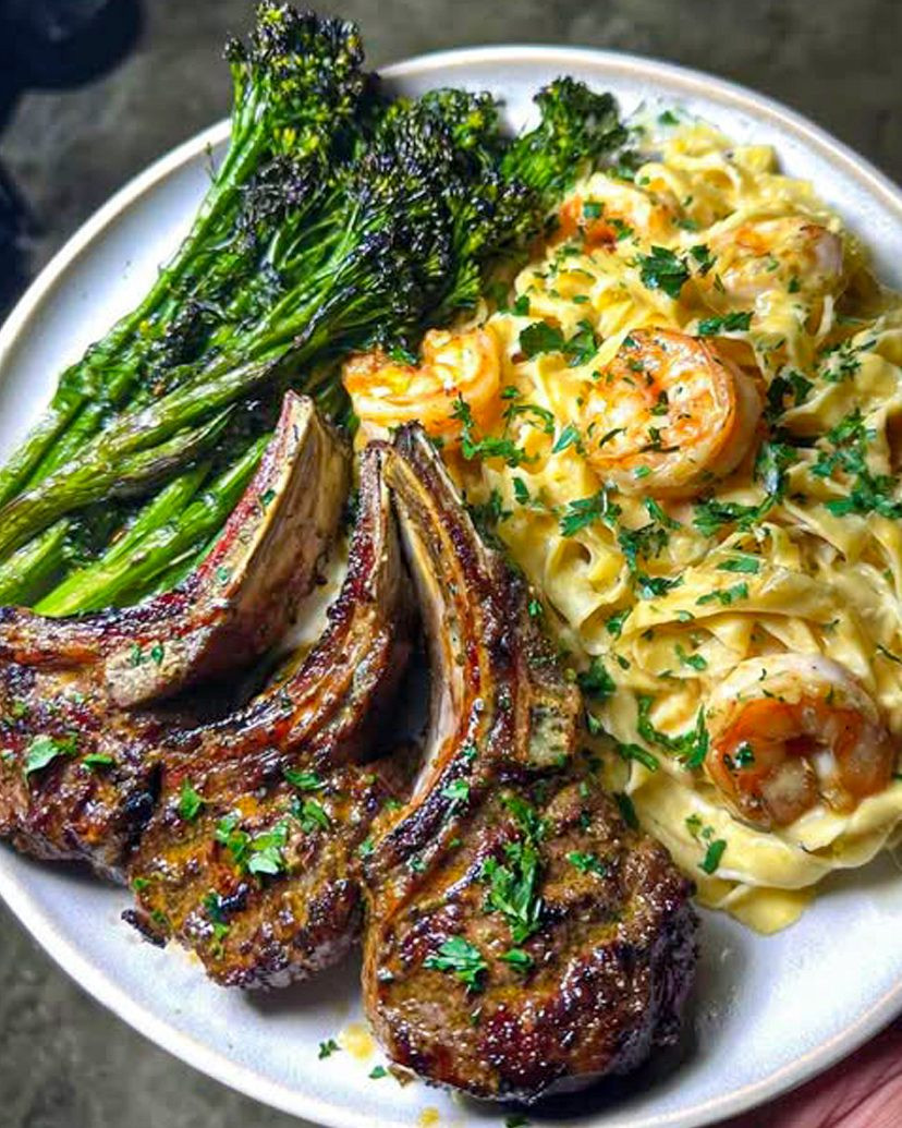 Bữa Tối Sang Chảnh Với Thịt Cừu Tỏi, Tôm Nước Sốt Alfredo Và Bông Cải Xanh Nướng