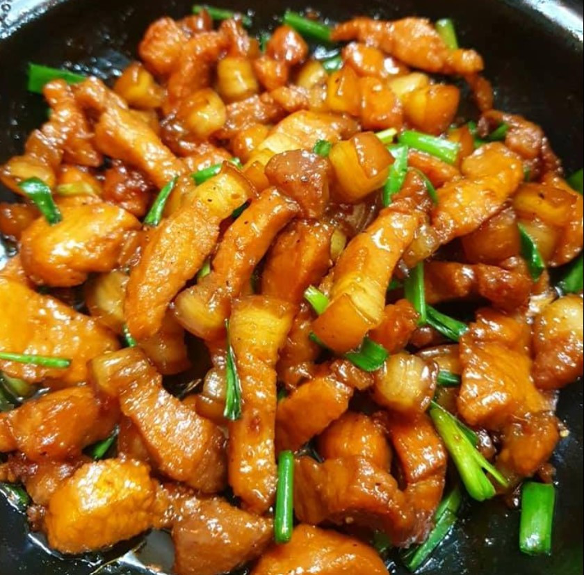 Thịt sơ chế sạch thái con chì. Ướp thịt với bột canh, nước mắm, hành khô. Cho dầu ăn vào nồi, cho đường vào. Khi đường chuyển sang màu cánh gián cho thịt đã ướp vào đảo đều. Vặn to lửa để nước rút vào thịt, đến khi nước cạn cho nước nóng vào hoặc nước dừa đã đun nóng vào. Đun sôi, hớt bọt, vặn nhỏ lửa kho liu riu, nước gần cạn tắt bếp cho thịt nghỉ ( kho 2 lần mới ngon). Bật bếp kho tiếp đến khi sền sệt thì cho tiêu đập dập vào và hành lá cắt khúc vào , tắt bếp.
