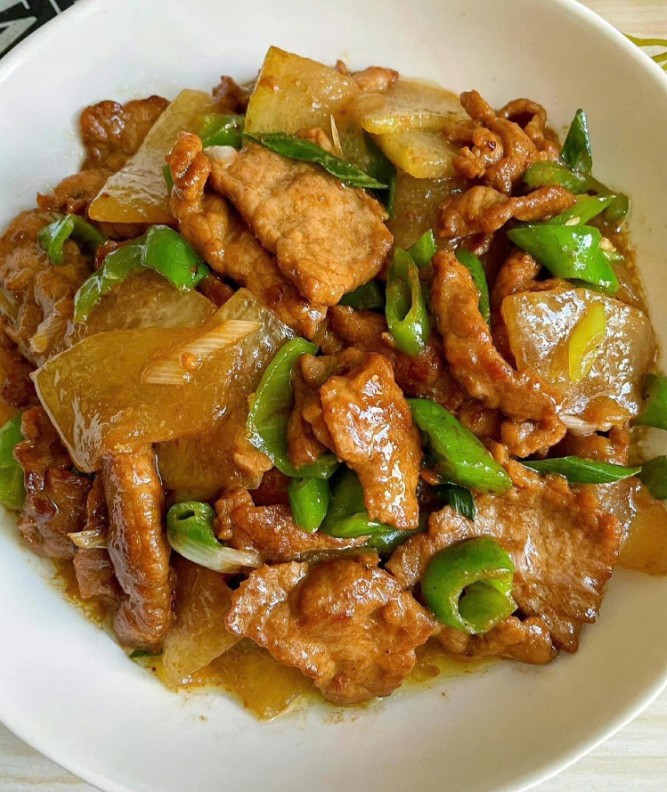 * Chuẩn bị nguyên liệu - Thịt lợn, ớt xanh, bí đao - Gia vị: mắm, dầu hào, dầu mè, bột bắp, xì dầu, hành ba rô * Cách chế biến 1. Thịt thái mỏng, ướp với 1 thìa nước mắm, 1 thìa rượu nấu ăn, 1 thìa dầu mè, 1 bột bắp, 1/2 thìa xì dầu, trộn đều ướp 10 phút 2. Dầu nóng, cho thịt vào xào chín rồi đổ bí đao vào, xào cho bí mềm rồi cho thêm ớt xanh, hành ba rô rồi đảo đều 3. Nêm thêm chút muối, hạt nêm, hạt tiêu, 1 thìa nước mắm, xào cho thịt và bí ngấm gia vị là xong,