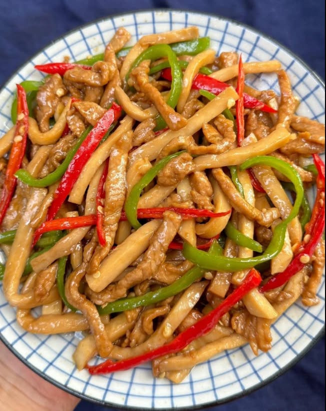 * Chuẩn bị nguyên liệu - Thịt lợn, nấm đùi gà, ớt chuông - Gia vị: mắm, dầu hào, muối * Cách chế biến: 1. Thịt thái sợi rồi ướp cùng 1/2 thìa nước mắm, 1/2 thìa dầu hào, 1/2 thìa bột bắp, 1/2 thìa dầu ăn, hạt tiêu xay, trộn đều ướp 5 phút 2. Nấm đùi gà mình thái con chì rồi chần qua nước sôi 1-2 phút, vớt ra để khô 3. Cho dầu vào chảo rồi cho thịt vào xào săn lại thì thì cho ớt và nấm vào xào cùng, nêm thêm 1 thìa nước mắm, 1 thìa dầu hào, đảo đều lại là xong Ẩn bớt Ẩn bớt