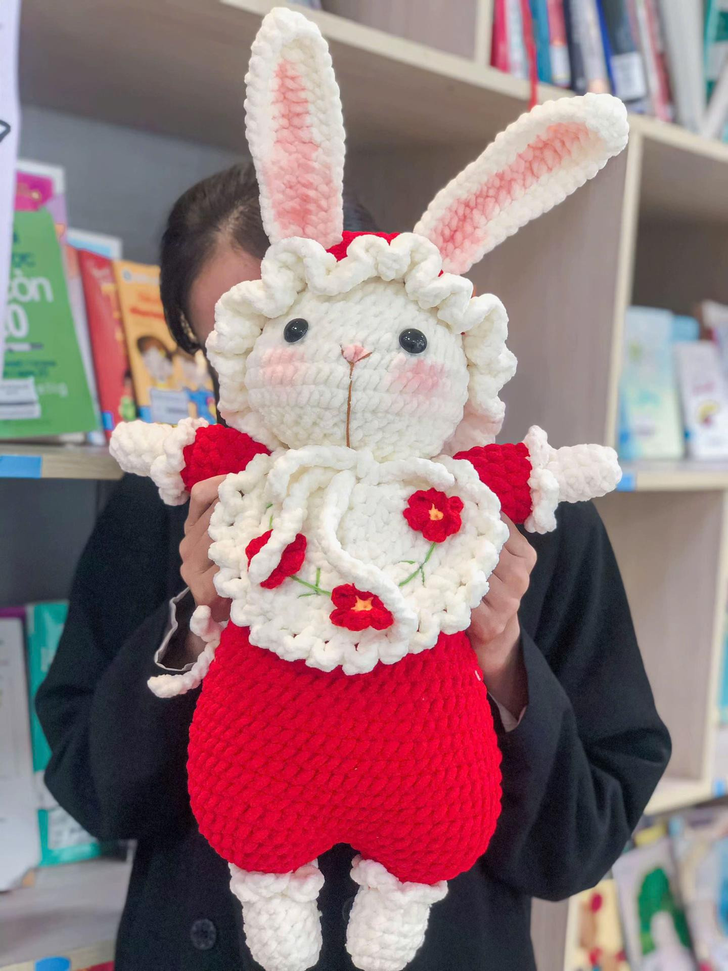 Thỏ bông len đỏ dễ thương với hoa thêu tay tinh tế