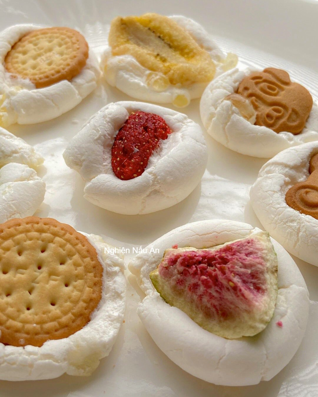 THỬ NGAY MÓN KẸO ĐÁM MÂY BẰNG NỒI CHIÊN KHÔNG DẦU NGỌT MỀM, GIÒN GIÒN, ĂN VUI MIỆNG LẮM LUÔN Nguyên liệu: - 1 gói kẹo marshmallow - 50g bánh quy nhỏ - Trái cây sấy lạnh (tuỳ thích) Cách làm 1. Nướng marshmallow - Lót giấy nến vào nồi chiên không dầu. - Cho marshmallow vào, chỉnh 120°C – 15 phút để kẹo mềm và phồng đẹp. 2. Thêm topping & nướng lần 2 - Đặt bánh quy và trái cây sấy lên phần marshmallow đã nướng. - Nướng thêm 5 phút cho topping dính chặt vào kẹo. Thành phẩm - Kẹo mềm dẻo, thơm ngọt, kết hợp bánh quy giòn và trái cây sấy chua nhẹ cực kỳ bắt miệng. - Làm nhanh dễ đẹp mắt, trẻ con hay người lớn đều mê! Chúc mọi người thành công với món kẹo đám mây siêu dễ thương này nhé!