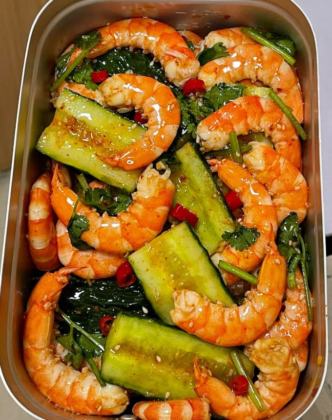 * Chuẩn bị nguyên liệu: -Tôm, tỏi băm, ớt, dưa chuột, rau thơm, vừng - Gia vị: mắm, dầu hào, muối, giấm, đường * Cách chế biến: 1. Lót gừng và hành xuống đáy nồi rồi rải tôm lên trên, rưới thêm 2 thìa rượu nấu ăn vào rồi đậy vung lại, luộc chín tôm rồi gắp ra. Đợi tôm nguội thì bóc sạch vỏ 2. Pha nước mắm: tỏi băm, ớt băm, vừng rồi rưới dầu nóng vào cho thơm. Cho thêm 3 thìa nước mắm, 1 thìa giấm, 1 thìa dầu hào, chút muối và đường rồi khuấy đều 3. Cho tôm, dưa chuột và rau thơm vào bát, đổ nước mắm vừa pha vào ngâm ít nhất 3 tiếng là ăn được