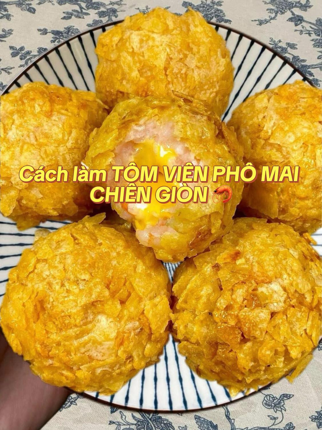 - Đun nóng dầu, cho từng viên tôm vào, chiên đến khi vàng giòn thì vớt ra là xong!