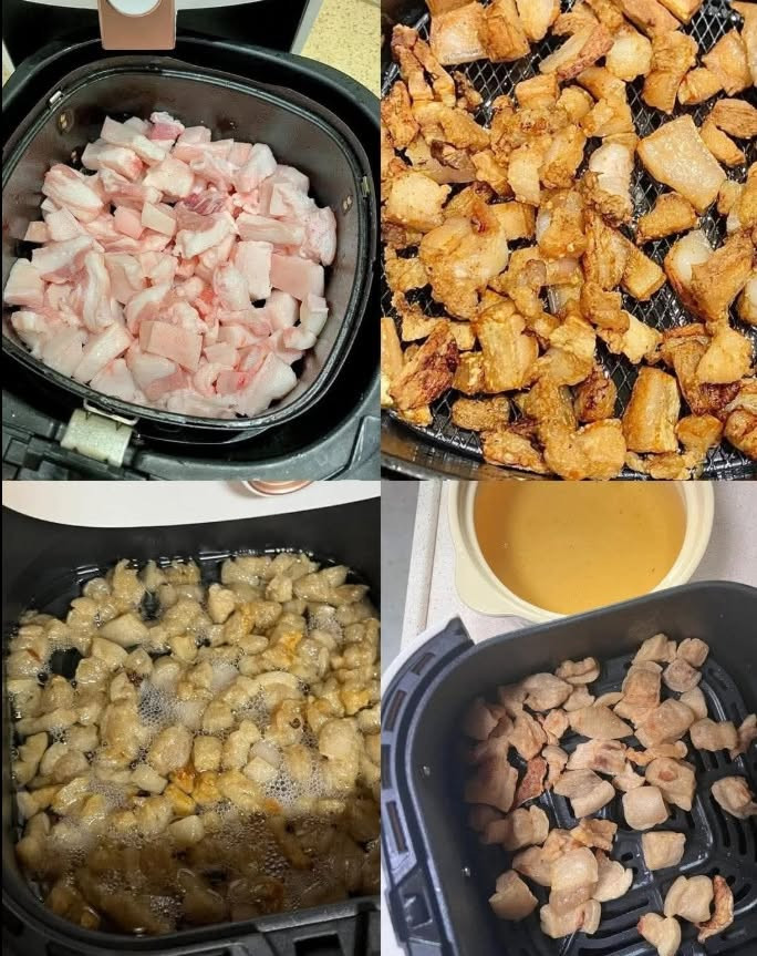 Bước 2: Cho mỡ vào nồi chiên không dầu - Lần 1 set nhiệt độ 150 độ trong 15 phút - Lần 2 set nhiệt độ 160 độ trong 10 phút. Sau đó đổ mỡ ở trong nồi ra và để nồi nghỉ khoảng 20 phút. - Cuối cùng set nhiệt độ 180 độ trong 15 phút là xong