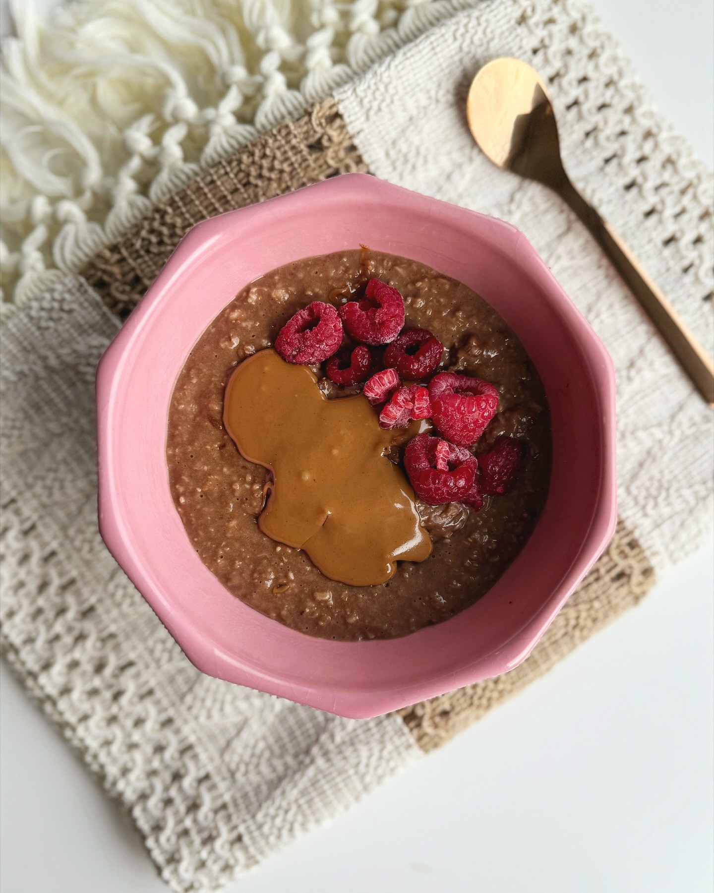 1) Combine the oats and milk in a small saucepan over medium heat until you get your desired texture. 2) Mix the protein and cocoa with some water into a homogenous paste. Stir through the oatmeal. 3) Top with the chocolate pb and some fruit of your choice.