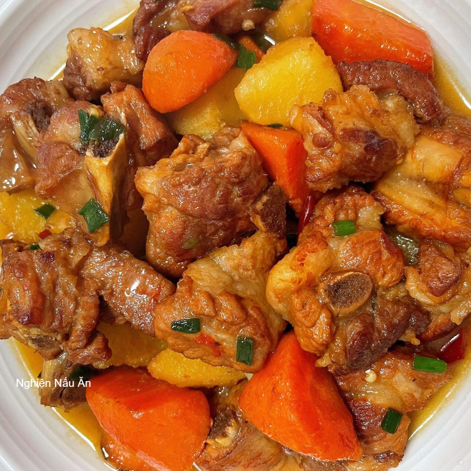 TRỔ TÀI VỚI CHỒNG VỚI CÔNG THỨC SƯỜN XÀO KHOAI TAY, CÀ RỐT MỀM THÊM ĐẬM VỊ DỄ LÀM Chuẩn bị nguyên liệu - Sườn heo - Khoai tây - Cà rốt - Ớt - Hành lá - Gia vị: đường phèn, muối, dầu hào, nước mắm Cách chế biến 1. Sơ chế sườn Luộc sơ sườn để loại bỏ mùi hôi và bọt bẩn, sau đó rửa lại cho sạch và để ráo. 2. Xào khoai tây và cà rốt Làm nóng dầu, cho khoai tây và cà rốt vào xào đến khi hơi xém cạnh để giữ độ bùi và giúp món ăn thơm hơn. Khi đạt màu đẹp, cho ra đĩa để riêng. 3. Làm nước màu và xào sườn Thêm chút dầu vào chảo, cho đường phèn vào đun đến khi tan và chuyển sang màu cánh gián. Đổ sườn vào đảo đều để miếng sườn lên màu đẹp mắt. Nêm thêm ớt, một chút muối, một thìa nước mắm và một thìa dầu hào. Đổ nước xâm xấp mặt sườn, đậy vung và đun lửa nhỏ khoảng hai mươi phút cho sườn mềm. 4. Hoàn thiện món ăn Cho khoai tây và cà rốt vào chảo, đun thêm mười phút để nước sốt sệt lại và thấm đều vào từng miếng sườn. Rắc hành lá lên trên để món ăn dậy mùi và đẹp mắt. Chúc cả nhà thành công với cách làm trên.