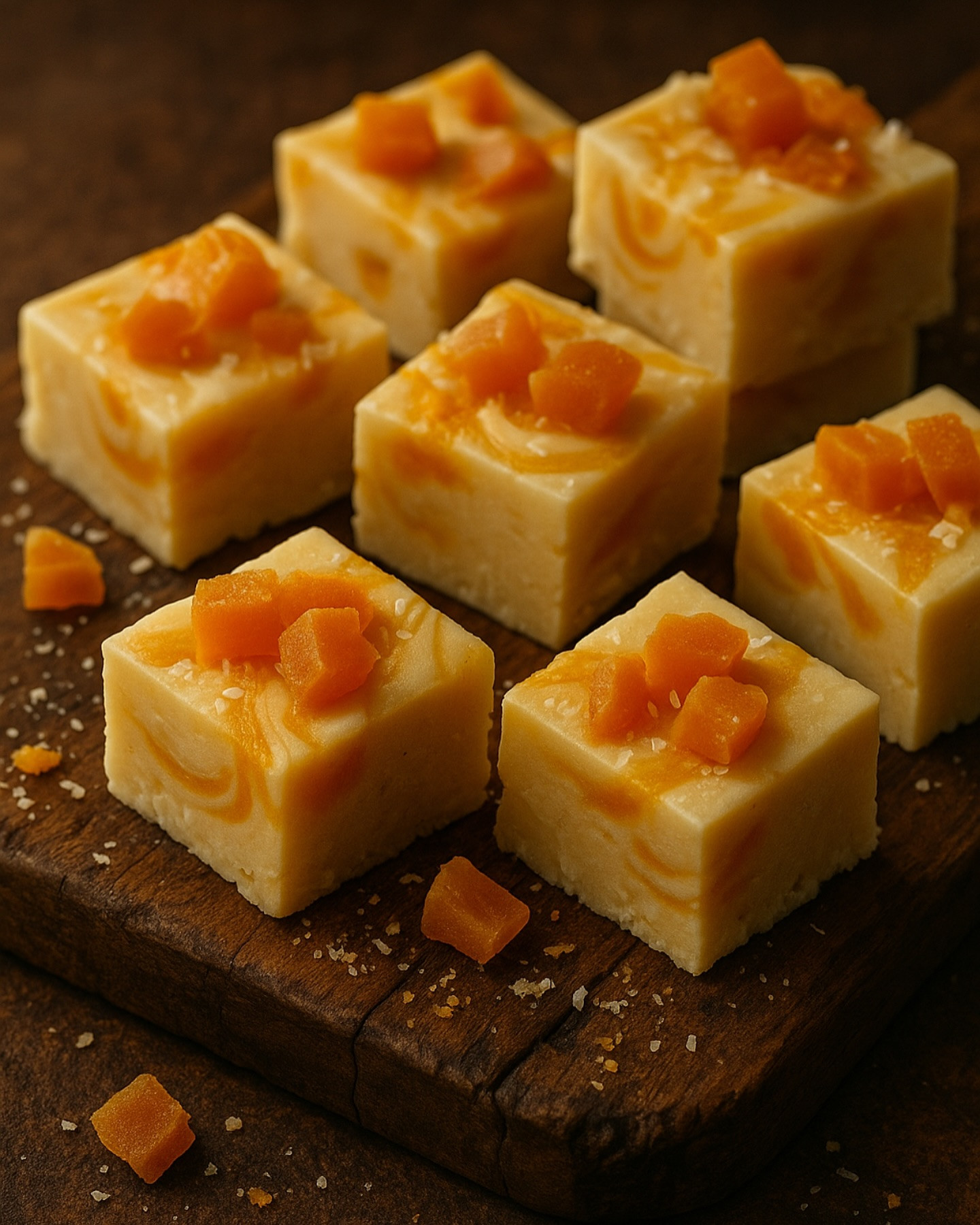 Quick Steps 1️⃣ Line an 8 × 8 in pan with parchment, leaving overhang. 2️⃣ In a saucepan over low heat melt white chocolate, coconut oil & condensed milk, stirring until smooth. Off heat, fold in salt and toasted coconut. 3️⃣ Pour two-thirds of mixture into pan. Dollop mango puree over top; swirl gently with a skewer. Cover with remaining fudge base; swirl again for marbled effect. 4️⃣ Sprinkle extra coconut & diced dried mango. Chill 3 h until firm. Lift out, cut into 1-in cubes, share the sunshine!