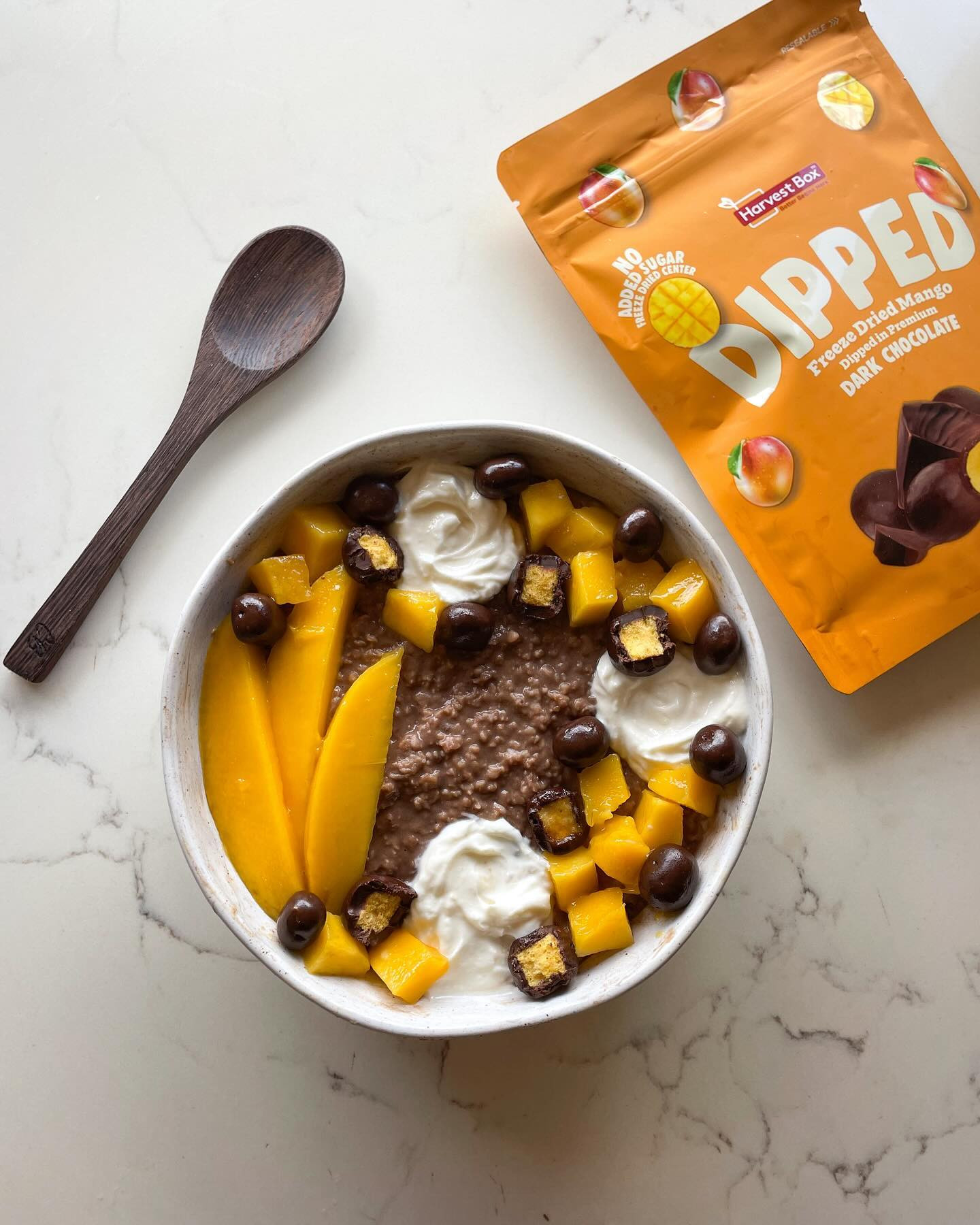 - 1/2c oats + water - 1 scoop chocolate protein powder - fresh mango - mango yoghurt - dark chocolate ‘dipped’ freeze-dried mango @harvestbox 🥭🍫